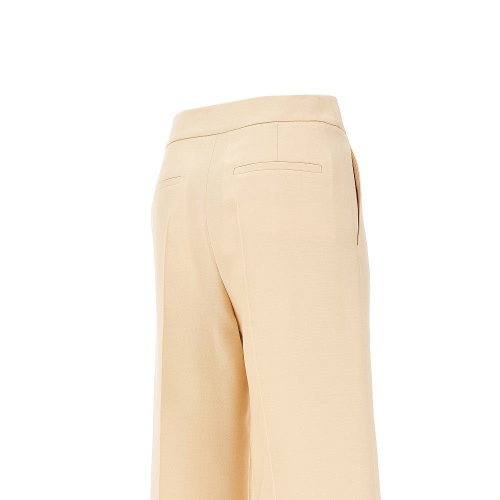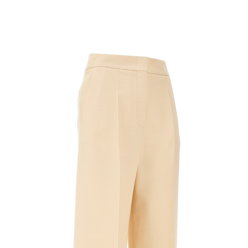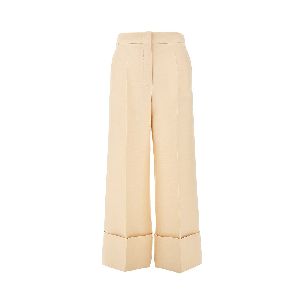 Cropped pants made from wool and silk blend Crepe Couture, featuring straight and wide leg with tailored pleat and wide bottom cuff. Mid-rise waist, zip fly and concealed hook and button closure. Side slanted pockets and rear welt ones.