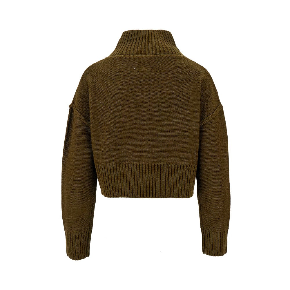 Cropped sweater made from virgin wool blend yarn, featuring distressed effect and expose seams. Ribbed standing collar, cuffs and bottom hem. Loose and relaxed silhouette with dropped armholes. Signature white stitchline on the back.