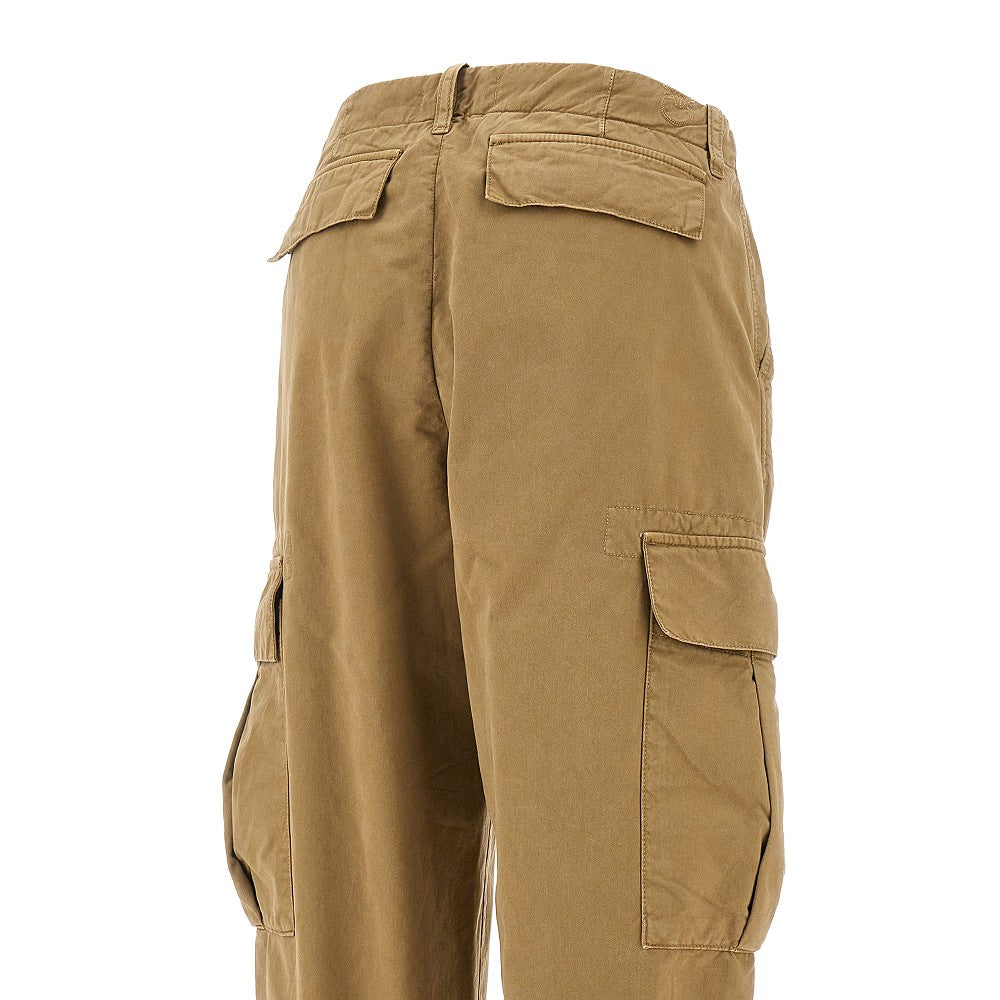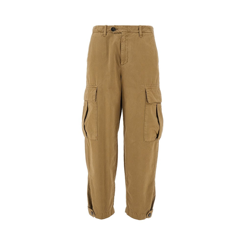 Cargo pants made from slightly washed-out cotton gabardine. Slightly wide and tapered leg with buttoned tab to adjuste the bottom. Mid-rise waist with belt loops, zip fly and button tab. Side slanted pockets and rear welt ones with flap.