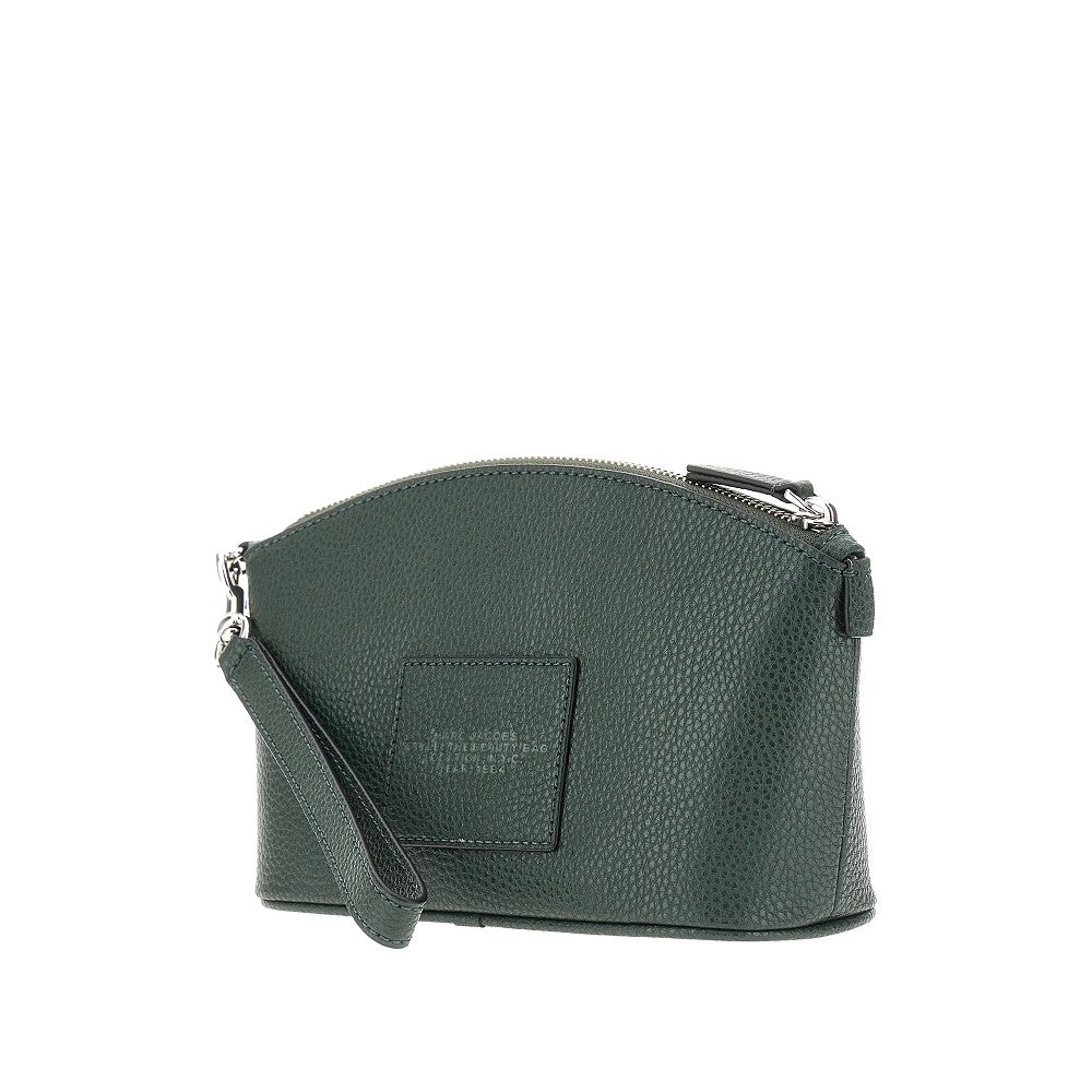 Beauty bag made from grained leather, featuring "THE BEAUTY BAG" and logo print on front. Removable wrist strap. Zip closure. Fabric lining. Gold-finished metalware.