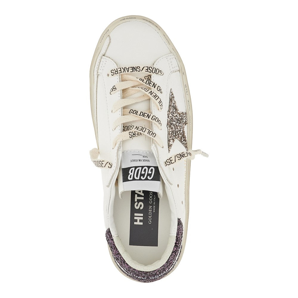 Sneakers made from smooth leather, featuring glittered heel and side star patch. Fabric logo label on the tongue. Lettering logo print on the heel tab. Lace-up closure witg logoes laces. Terry fabric lining. Removable leather insole. Rubber platform sole.