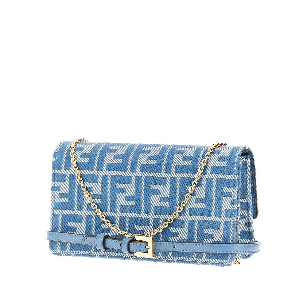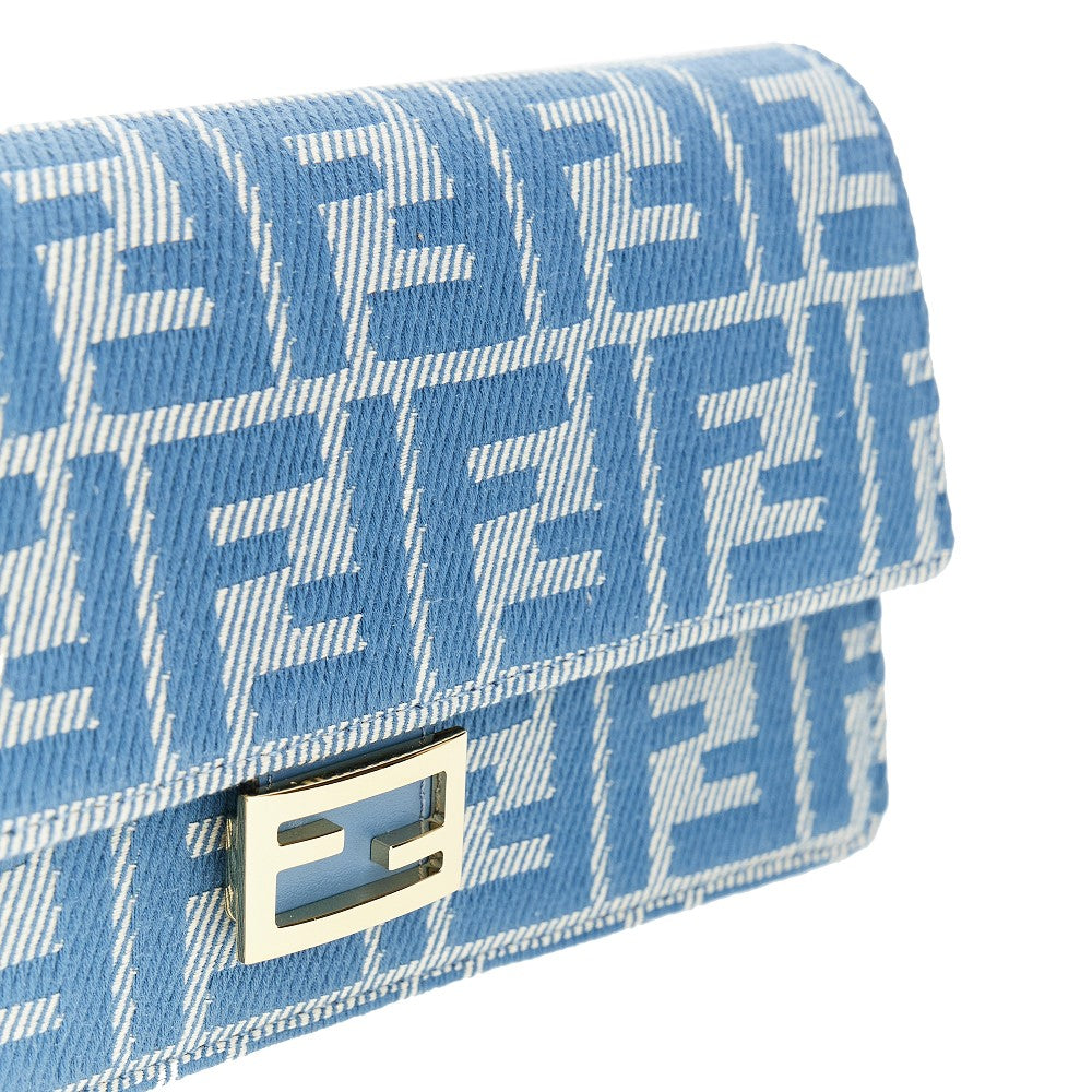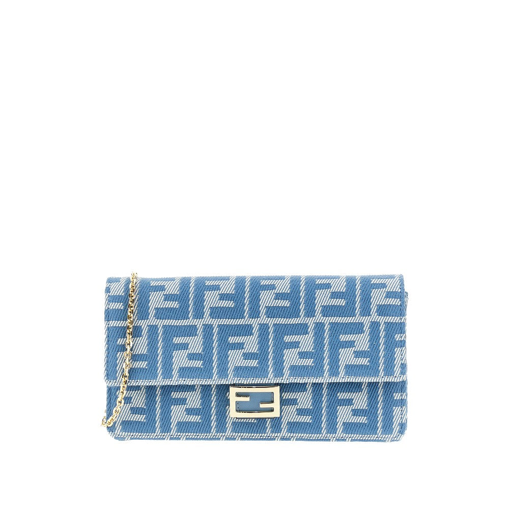 Clutch made from denim-effect canvas with all-over jacquard FF motif. Flap with press-stud closure, enriched with signature Baguette buckle in gold-finished metal. Equipped with both detachable leather handle and chain strap. Leather interior with one flap pocket and six card slots.