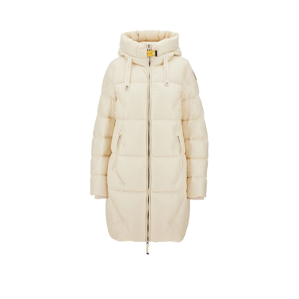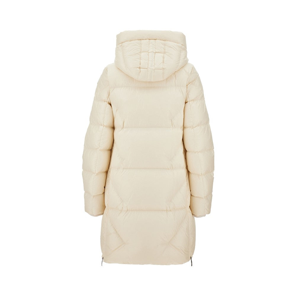 Mid-thigh jacket made from nylon taffetà with goose down padding, enriched with ribbon details on the shoulders and logo patch on the left sleeve. Two-way zip closure, webbing tab with press-stud on the neck, hood with drawstring and side welt pockets. Micro ribbed jersey cuffs. Side zipped splits.