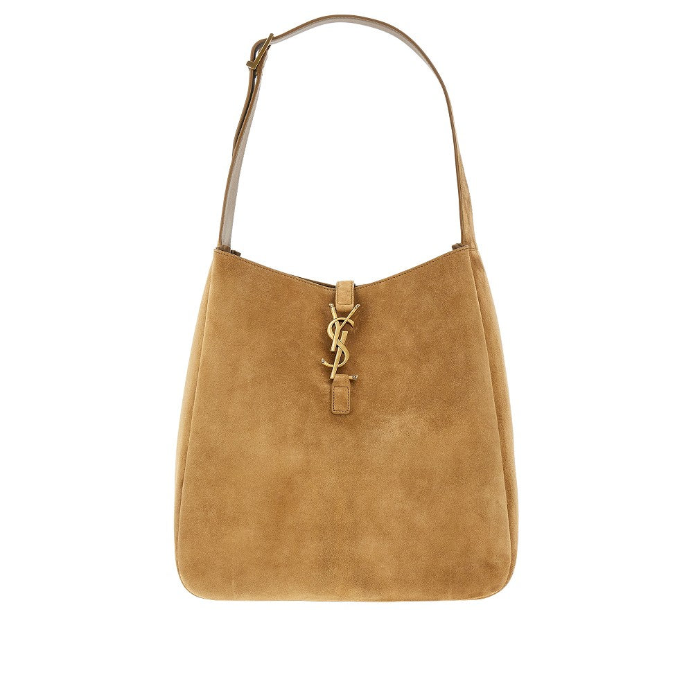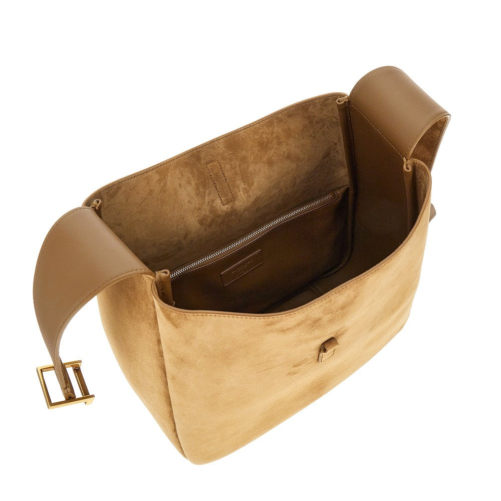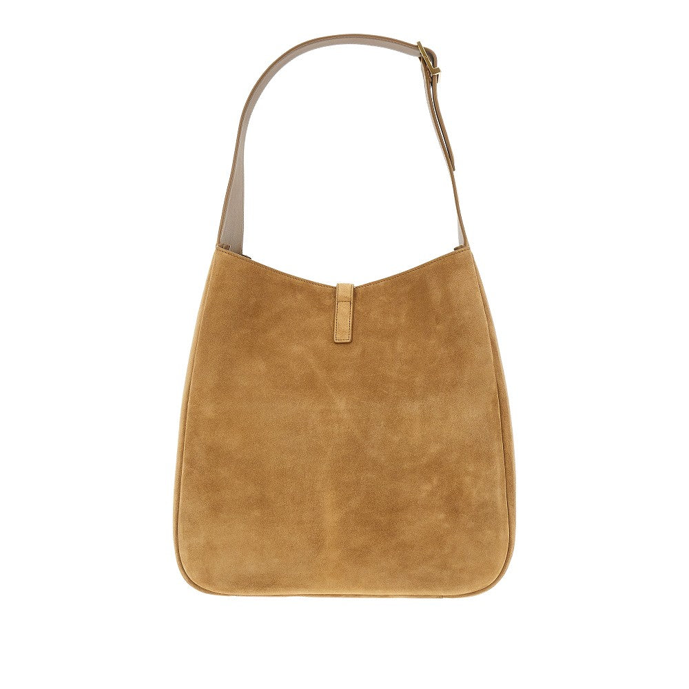 Shoulder bag made from soft suede leather, featuring Cassandre hook closure. Adjustable handle featuring squared buckle with engraved lettering logo. Suede leather lining and one inner zippered pocket. Antique gold finished metalware.
