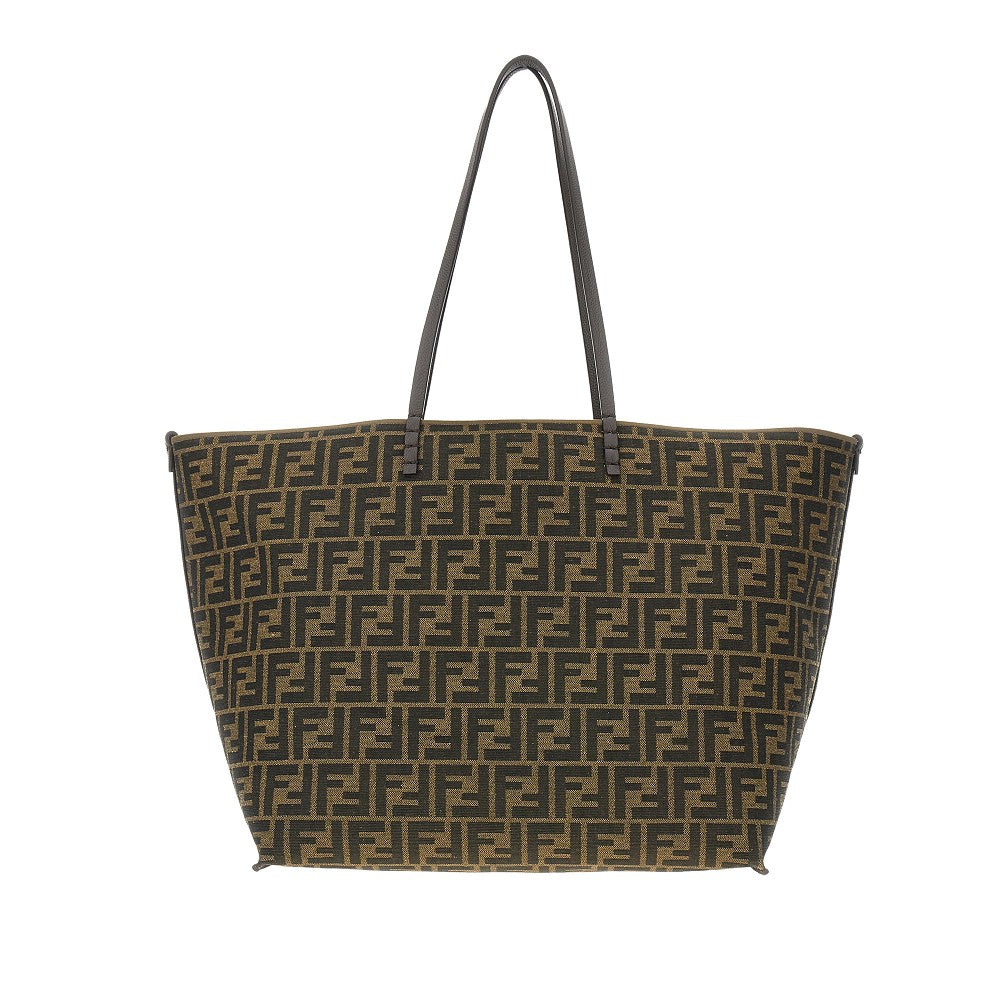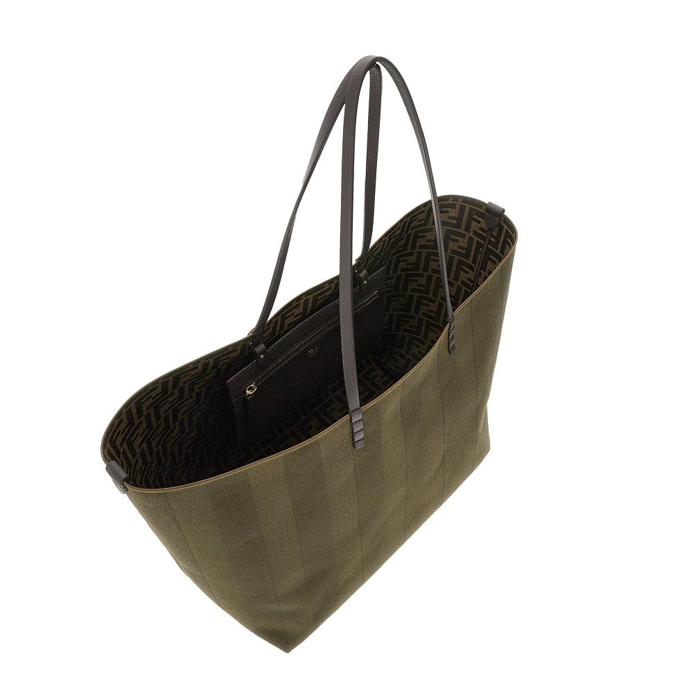 Reversible shopping bag made from jacquard fabric with Pequin striped motif on one side and signature FF motif on the other one. Soft leather handles to carry by hand or on the shoulder. Inner detachable leather pouch with zip closure.