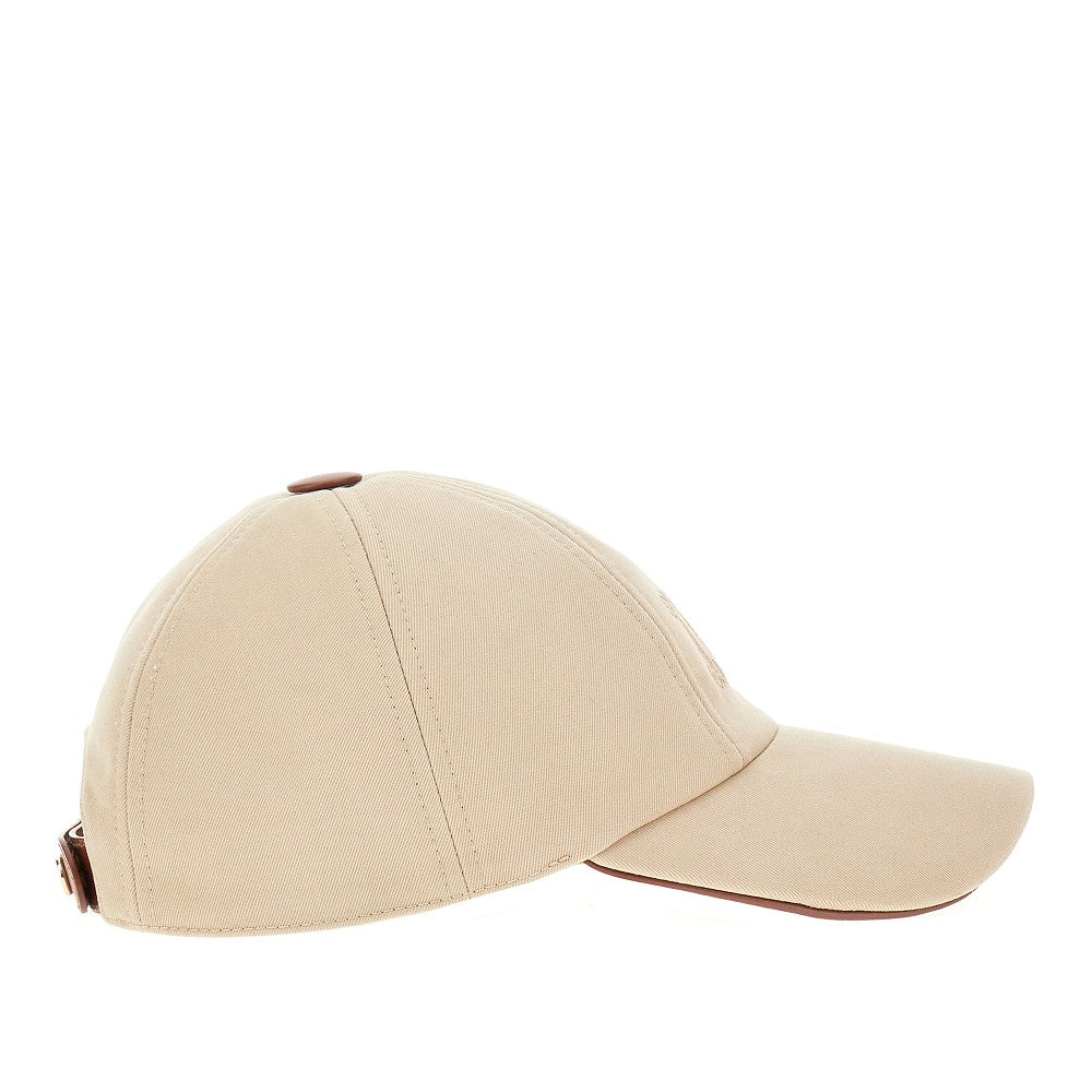 Baseball hat made from cotton twill with leather details and trims, enriched with monogram embroidery on front. Rear adjustable leather strap with gold-finished metal press-studs with engraved monogram. Visor with suedette lining. Branded viscose lining.
