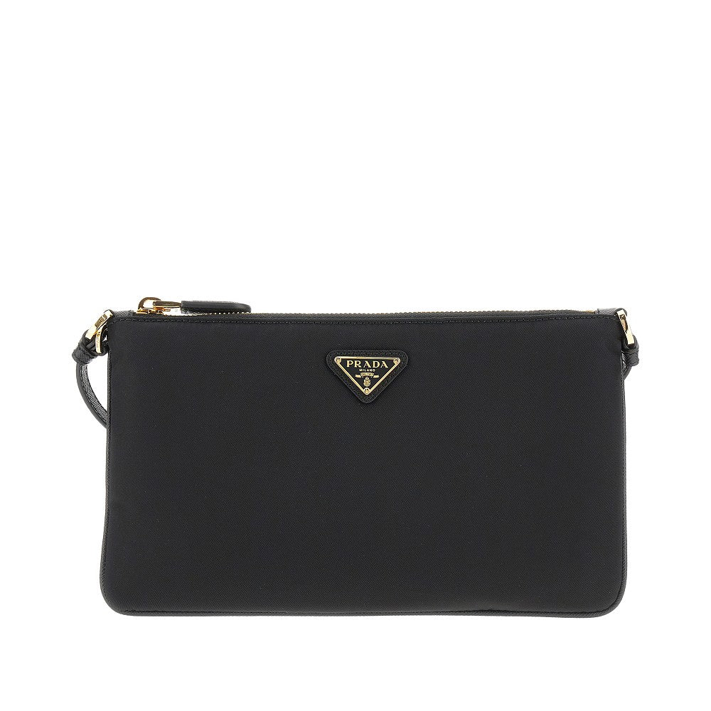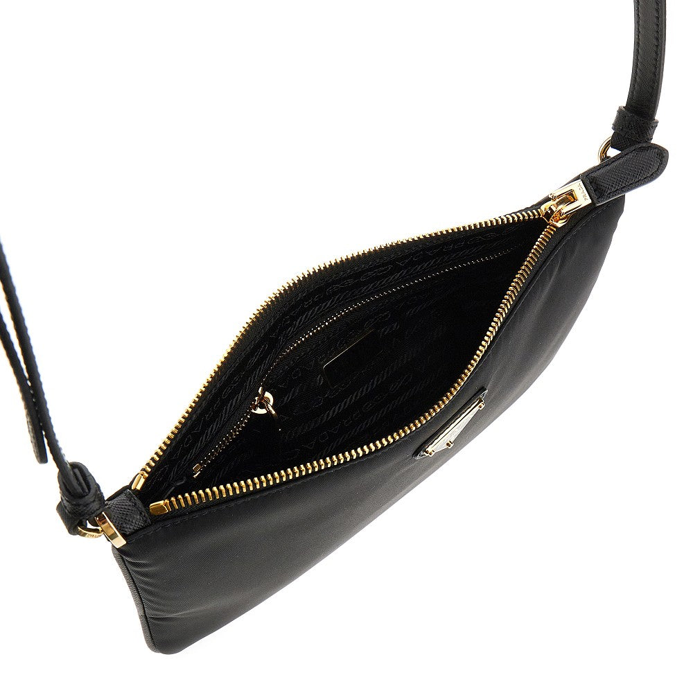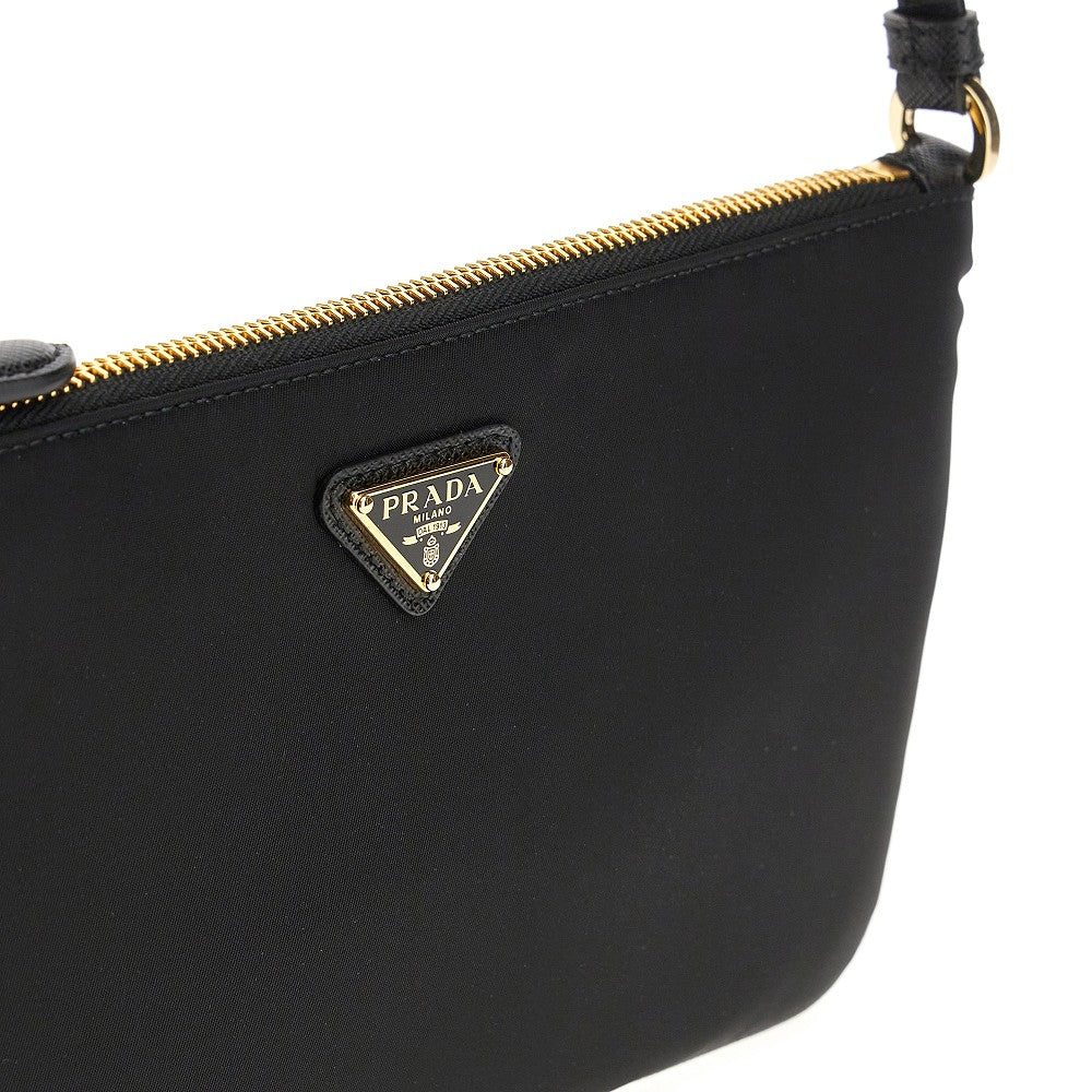 Bag made from Re-Nylon regenerated nylon with Saffiano leather trims and adjustable handle. Signature metal and enamel triangle logo on front. Zip closure. Branded nylon lining and one inner zippered pocket. Gold-finished metalware.