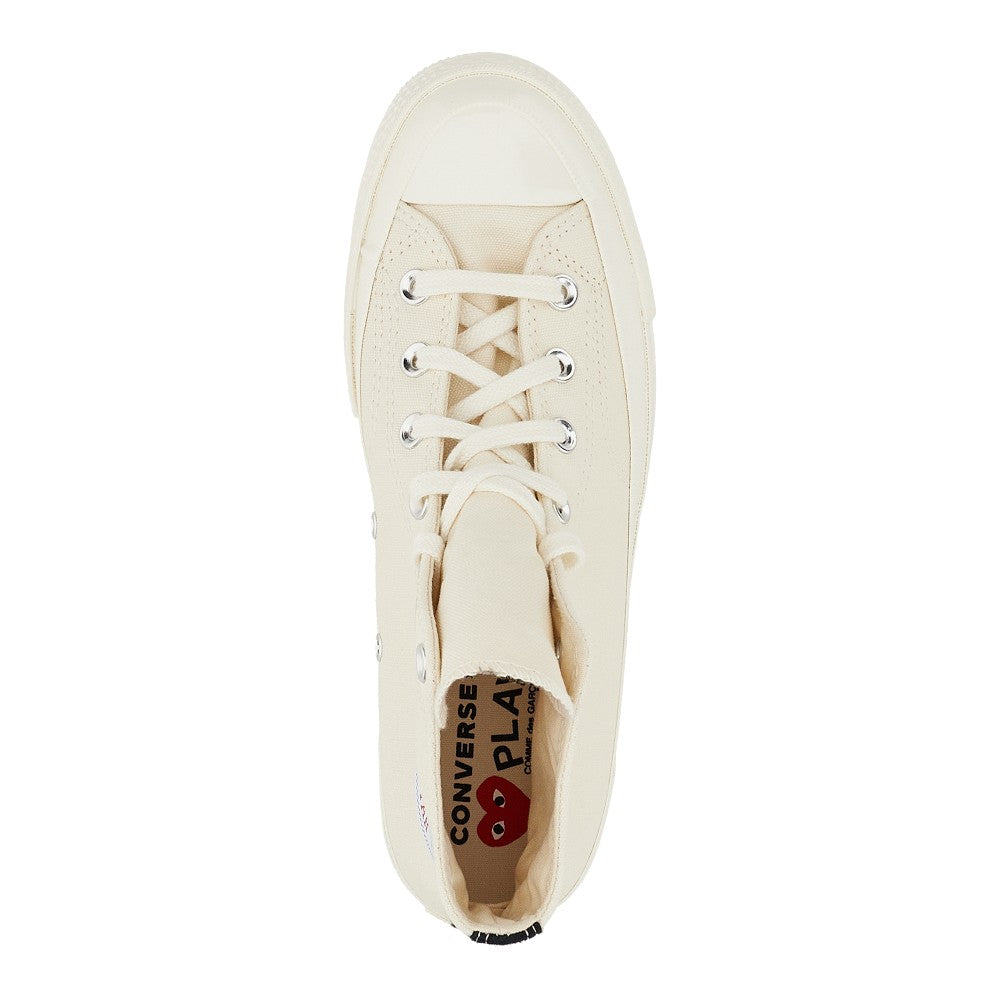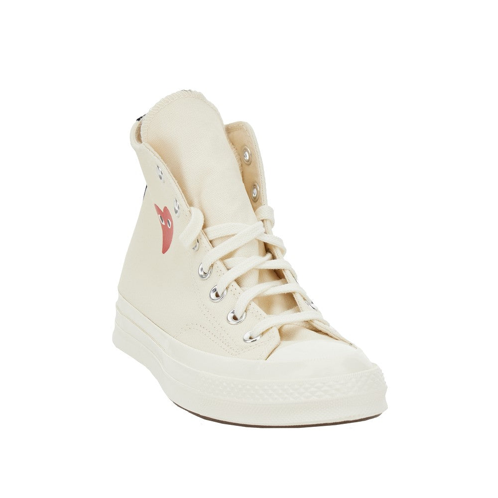 Signature Converse Chuck 70 sneakers, in collaboration with Comme des Garçons, made from canvas and enriched with heart print on the outer side. Contrasting ribbon detail on the back. Lace-up closure. Converse logo print on the inner side. Fabric lining and removable insole. Rubber sole.