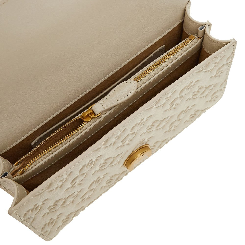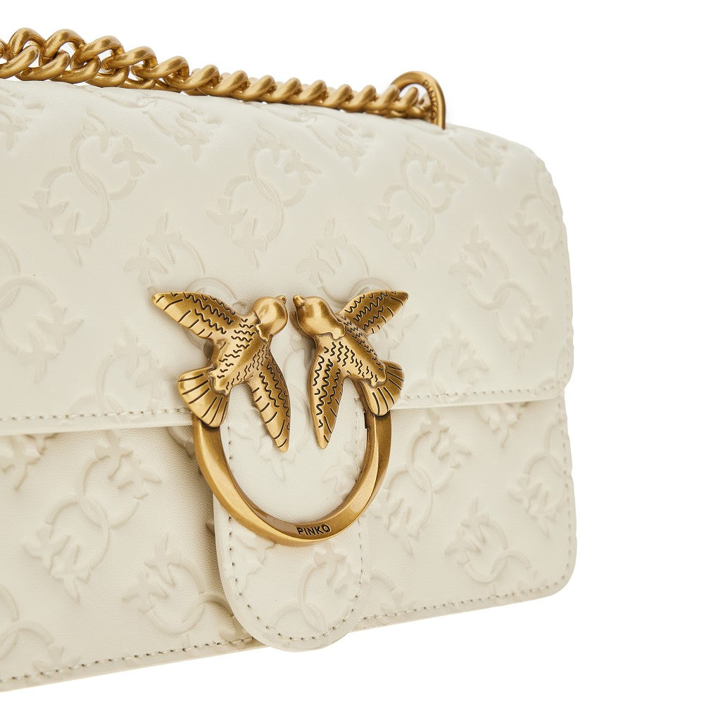 Bag made from leather with debossed Love Birds motif, featuring flap with magnetic joint closure enriched with Love Birds buckle in antique gold finished metal. Sliding and adjustable chain strap with leather insert. Suedette lined interior with two compartments, a patch pocket and a zippered one.