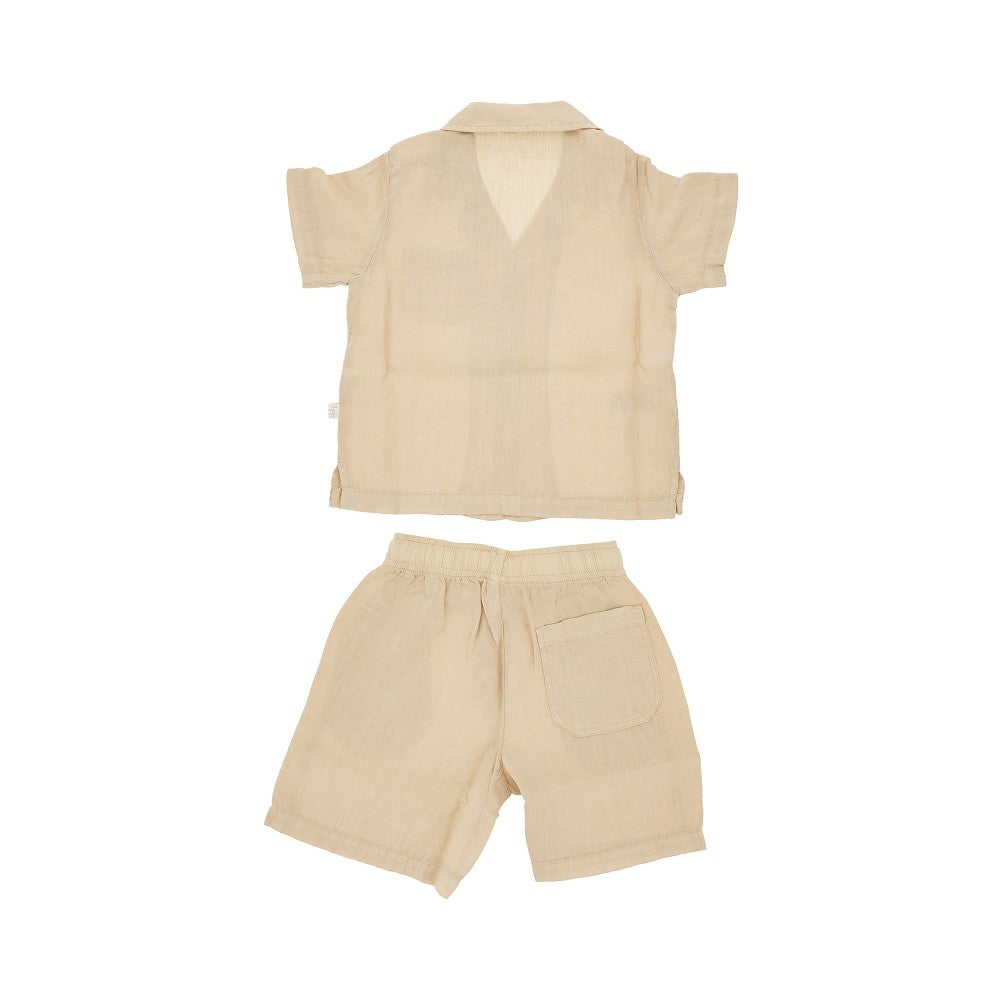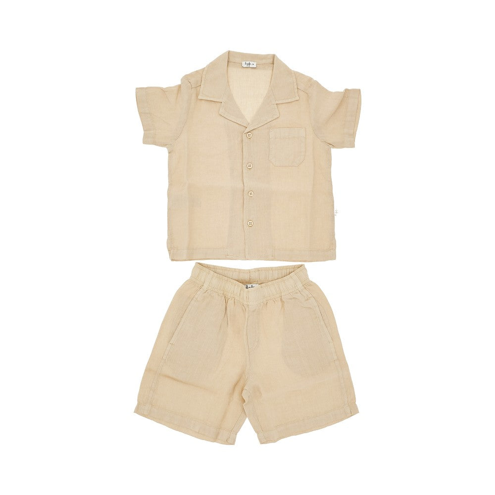 Two-piece set made from pure linen fabric. Short-sleeved shirt with bowling collar, front buttoning, chest patch pocket and side splits at bottom. Shorts with side welt pockets, one rear patch pocket and elasticated waist with inner drawstring.