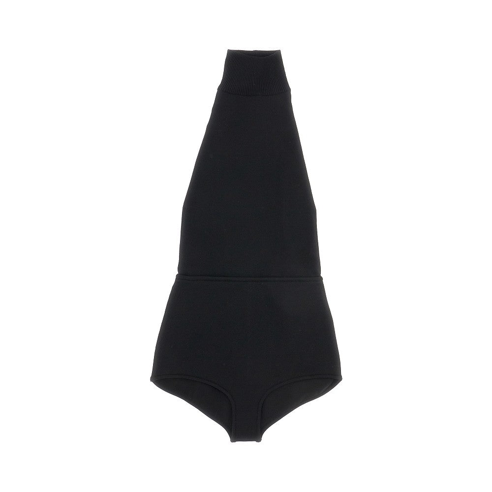 Sleeveless bodysuit made from stretch viscose-blend compact knitted fabric, featuring halter neck design with ribbed turtleneck and open back with decorative horizontal strap. Concealed zip closure on the back.