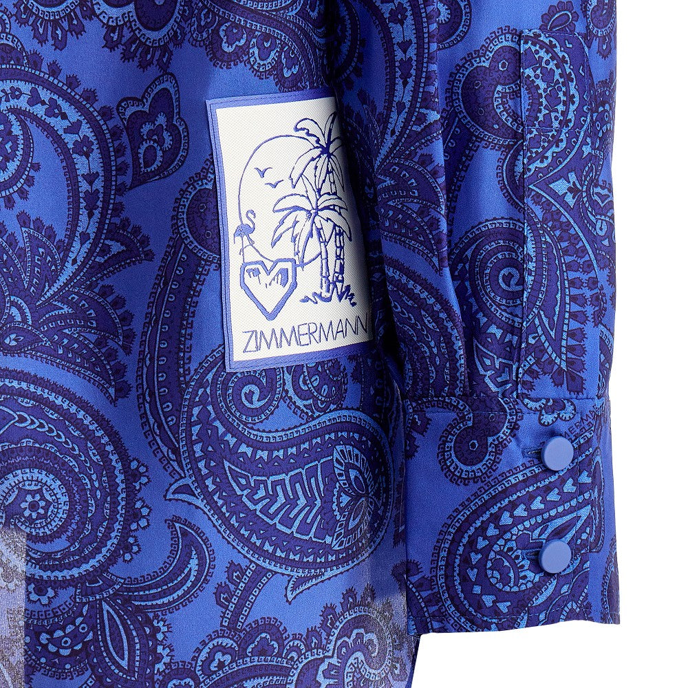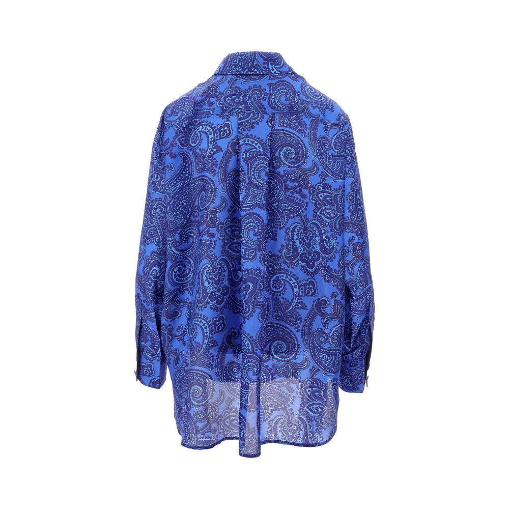 Shirt made from silk habotai with paisley motif, enriched with jacquard fabric patch on the bottom. Pointed collar, front closure with tone-on-tone buttons and two-button rounded cuffs. Oversized silhouette.