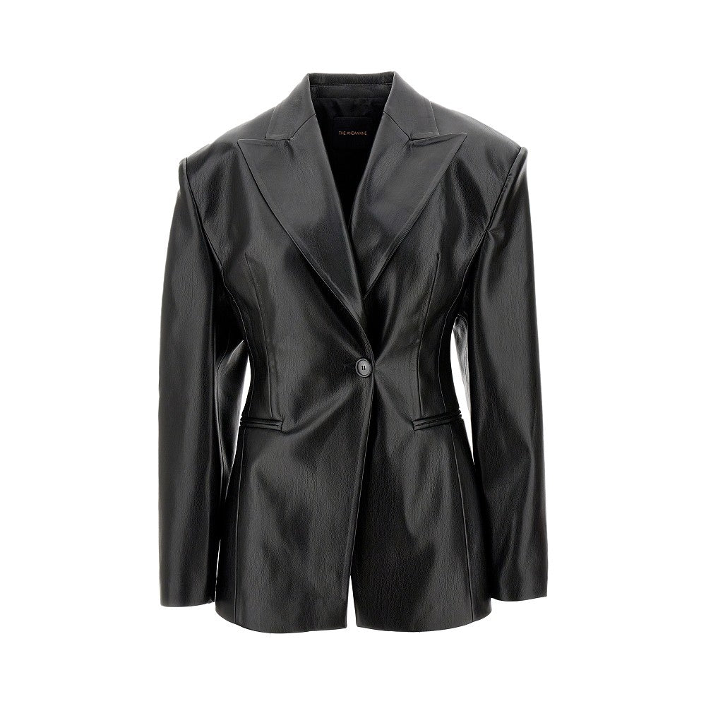 Blazer made from soft vegan nappa leather, featuring hourglass silhouette with padded oversized shoulders and cinched waistline. One-button single-breasted closure, peak lapel collar, side welt pockets and buttoned cuffs. Lined.