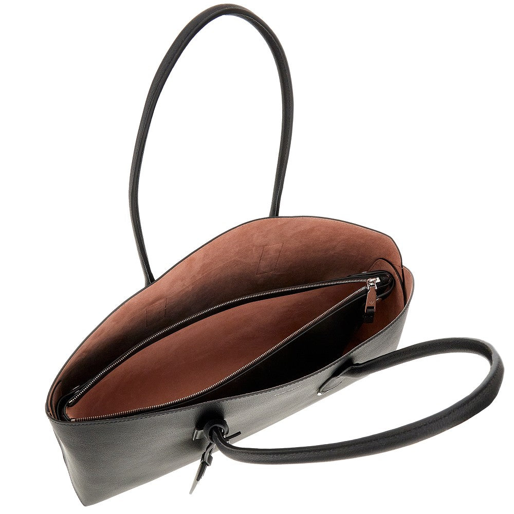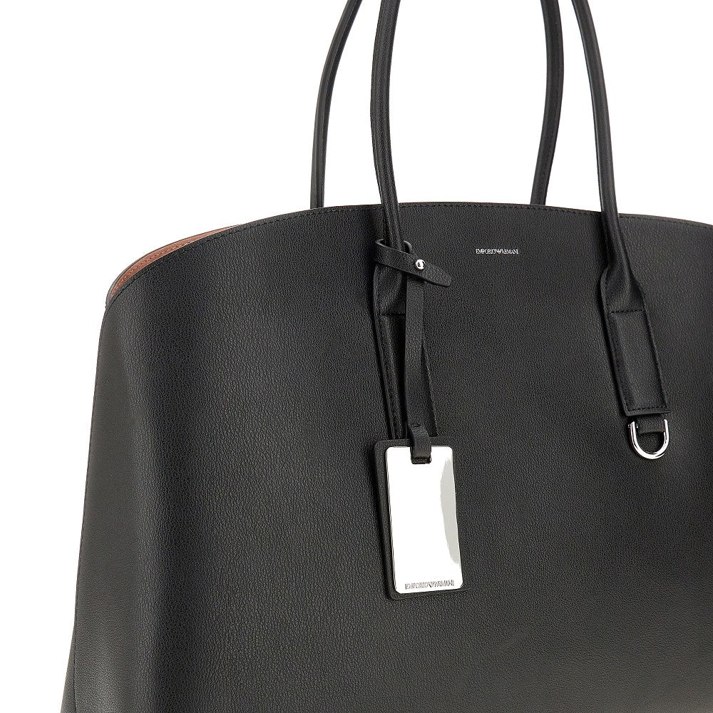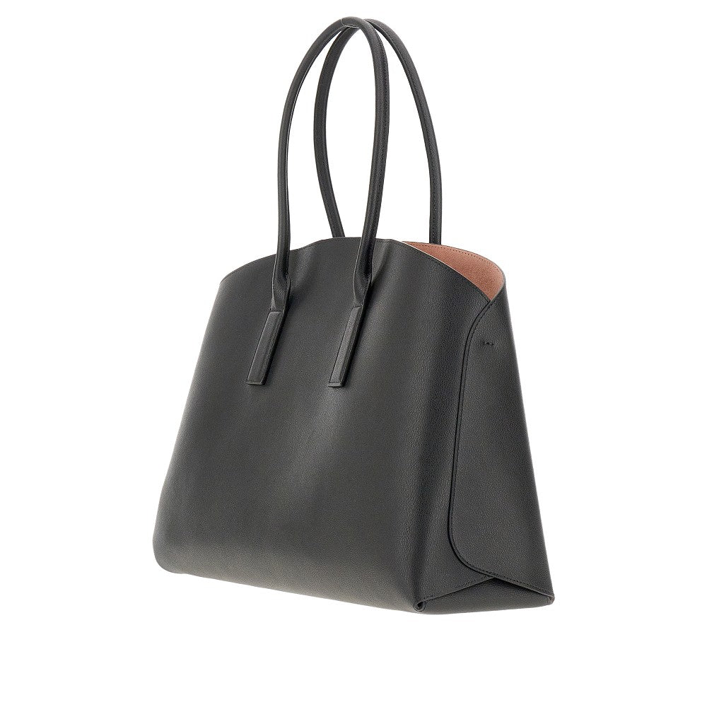 Shopping bag partially made from regenerated leather with polyurethane coating. Silver-tone mini logo print on front. Double handle to carry by hand or on the shoulder. Removable charm with silver-finished metal plate with engraved logo. Suedette lining and inner detachable zippered pouch.