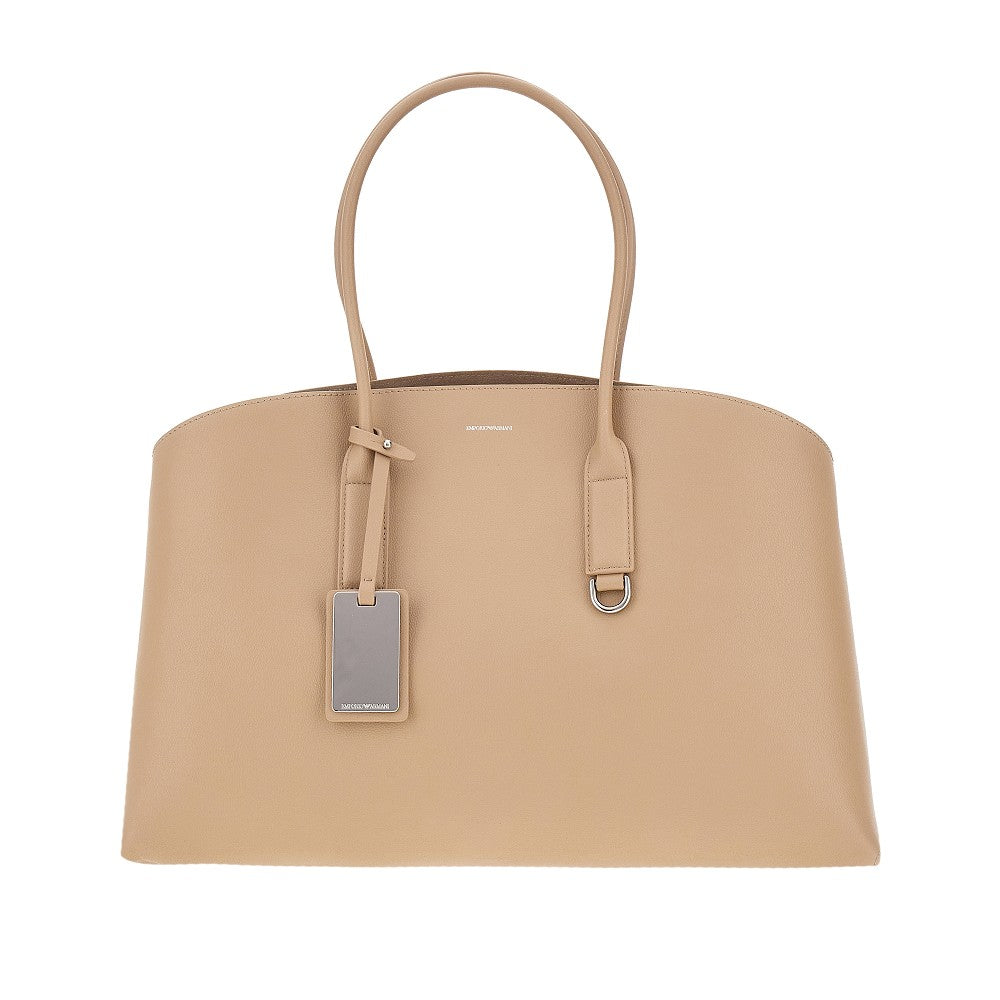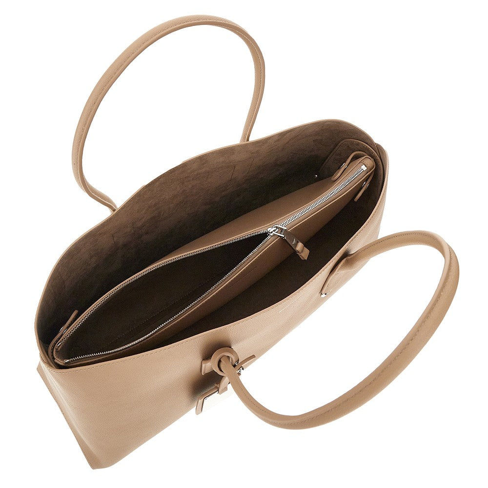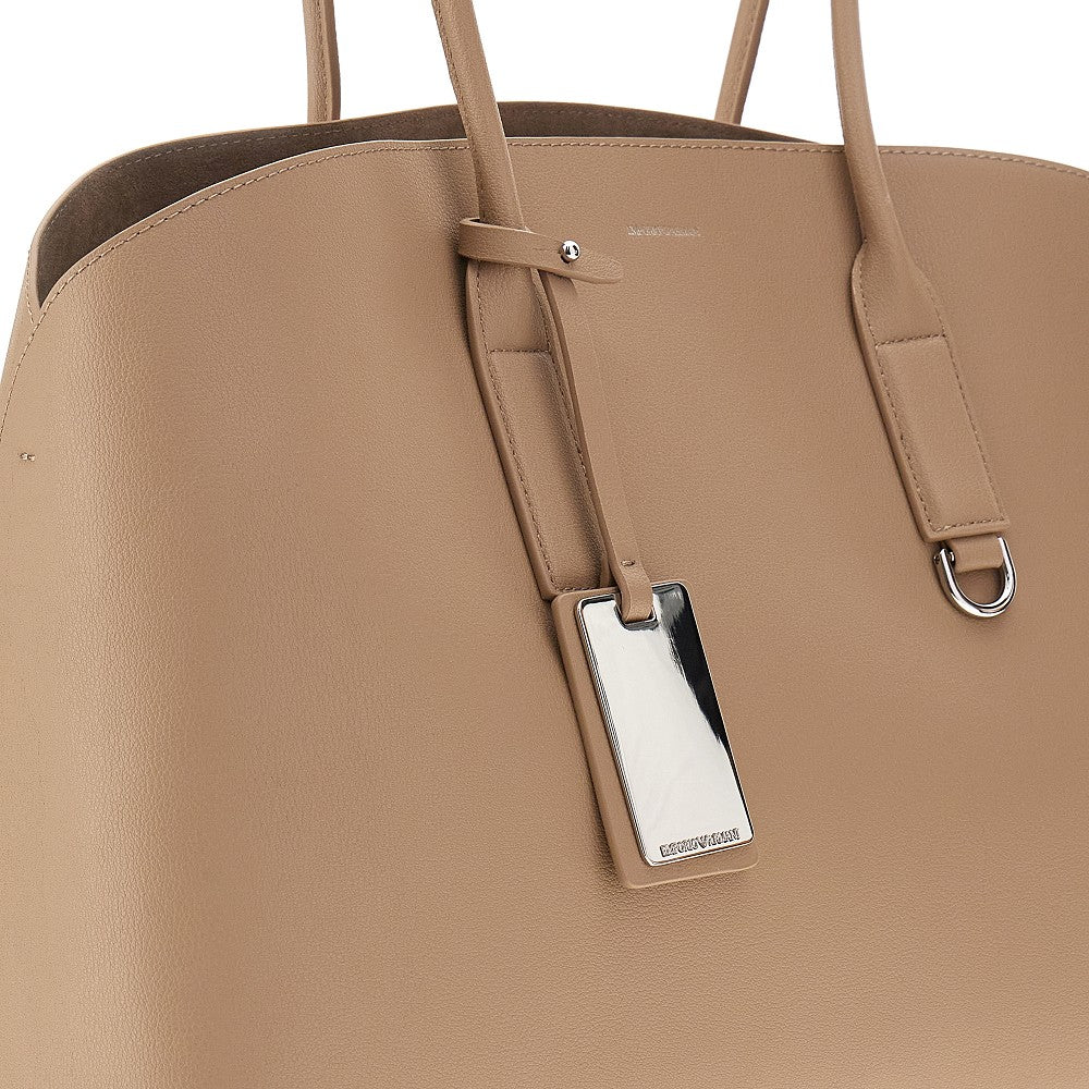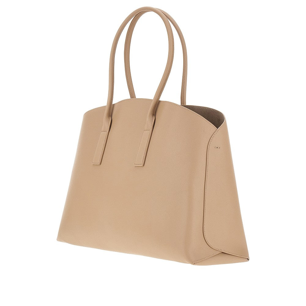 Shopping bag partially made from regenerated leather with polyurethane coating. Silver-tone mini logo print on front. Double handle to carry by hand or on the shoulder. Removable charm with silver-finished metal plate with engraved logo. Suedette lining and inner detachable zippered pouch.