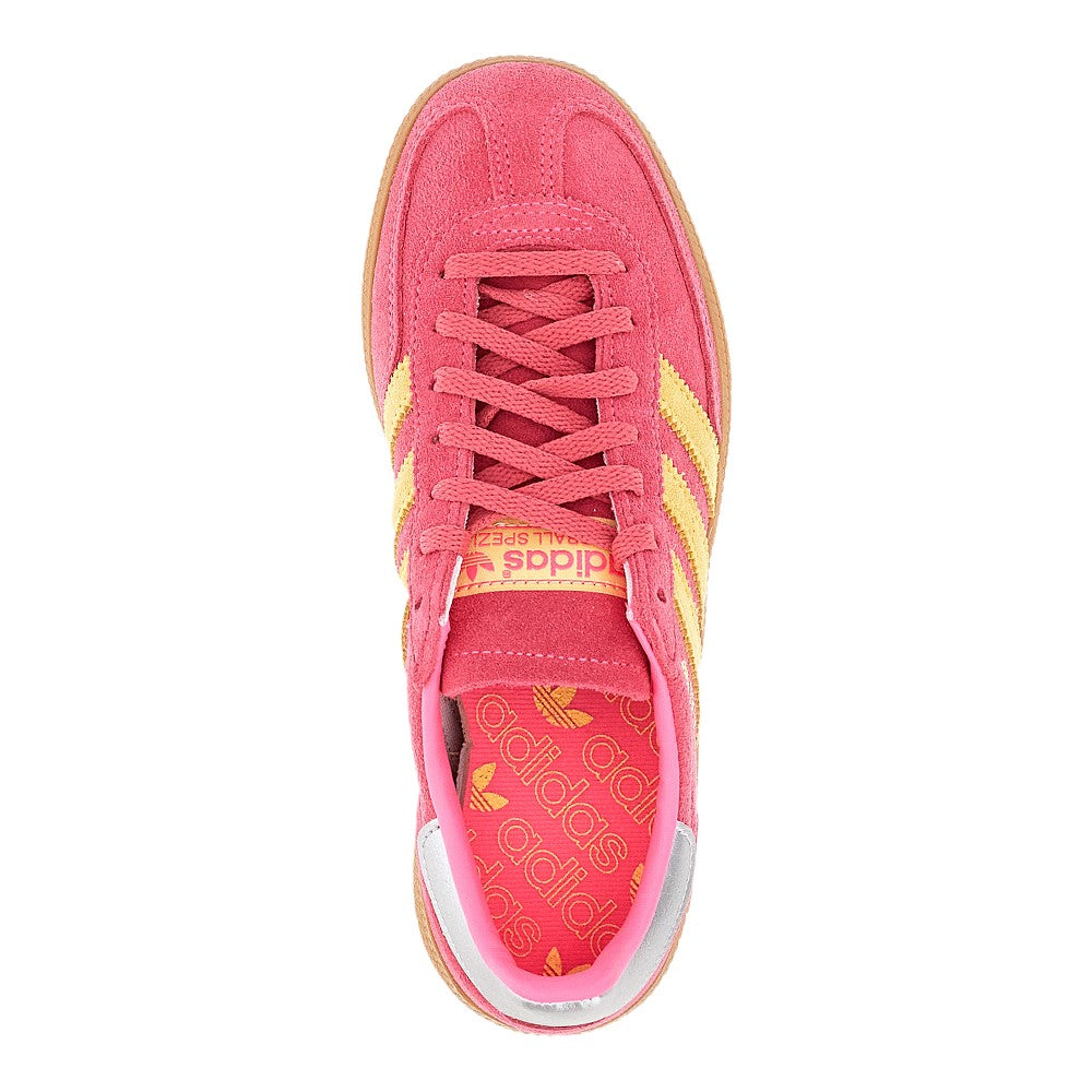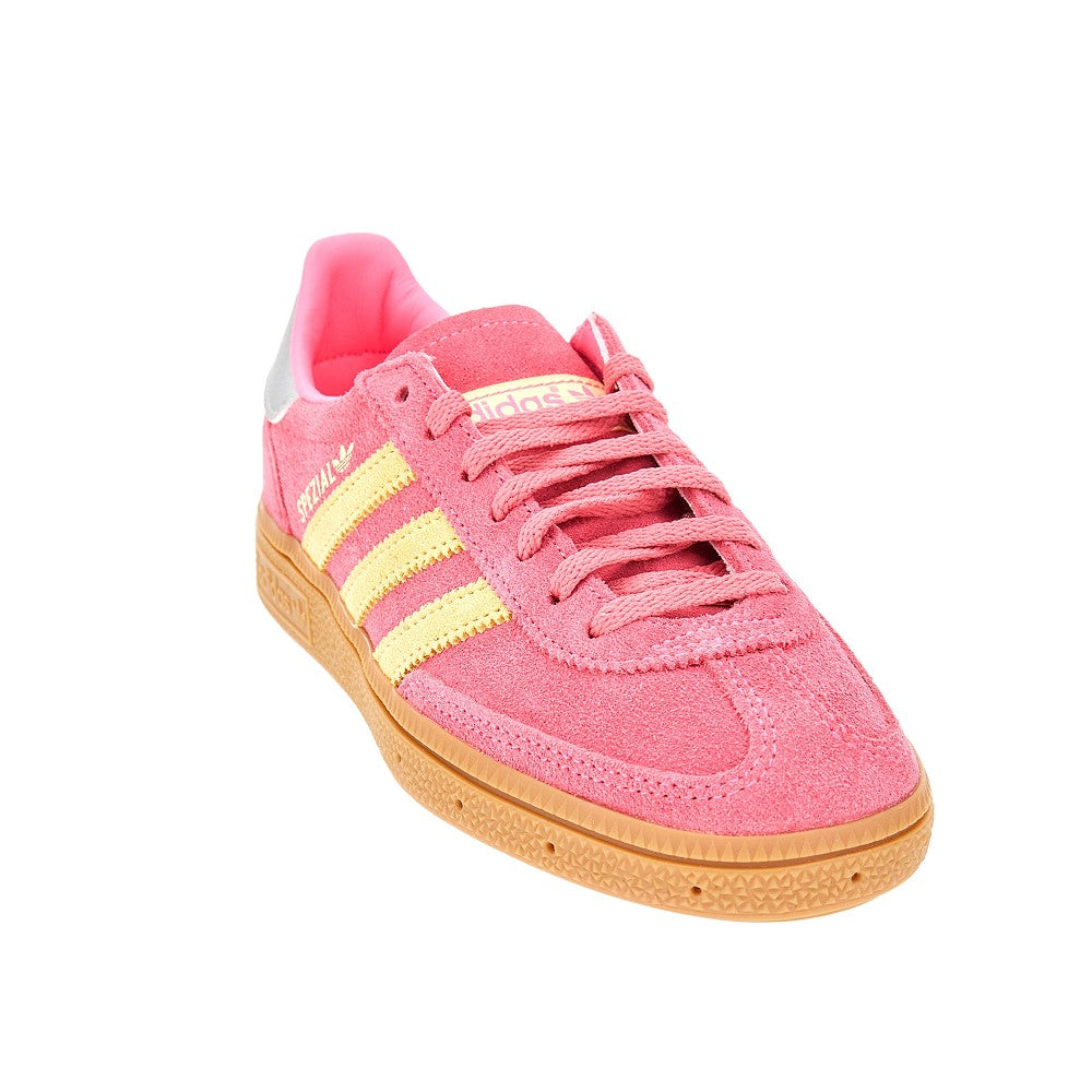Handball Spezial sneakers made from nubuck leather with metallized faux leather details, featuring signature 3 Stripes on the sides. Fabric logo patch on the tongue. Lace-up closure. Gold-tone "Spezial" print on the side. Fabric lining and removable insole. Rubber sole.