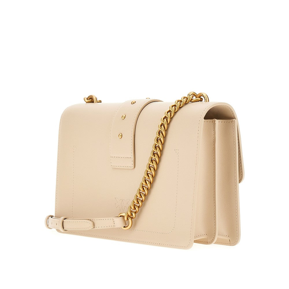 Love One Classic bag in smooth leather, featuring flap with magnetic joint closure and Love Birds buckle. Adjustable chain and leather shoulder strap. Suede fabric lined interior with two compartments, a zippered pocket and a patch one. Antique gold-finished metalware.