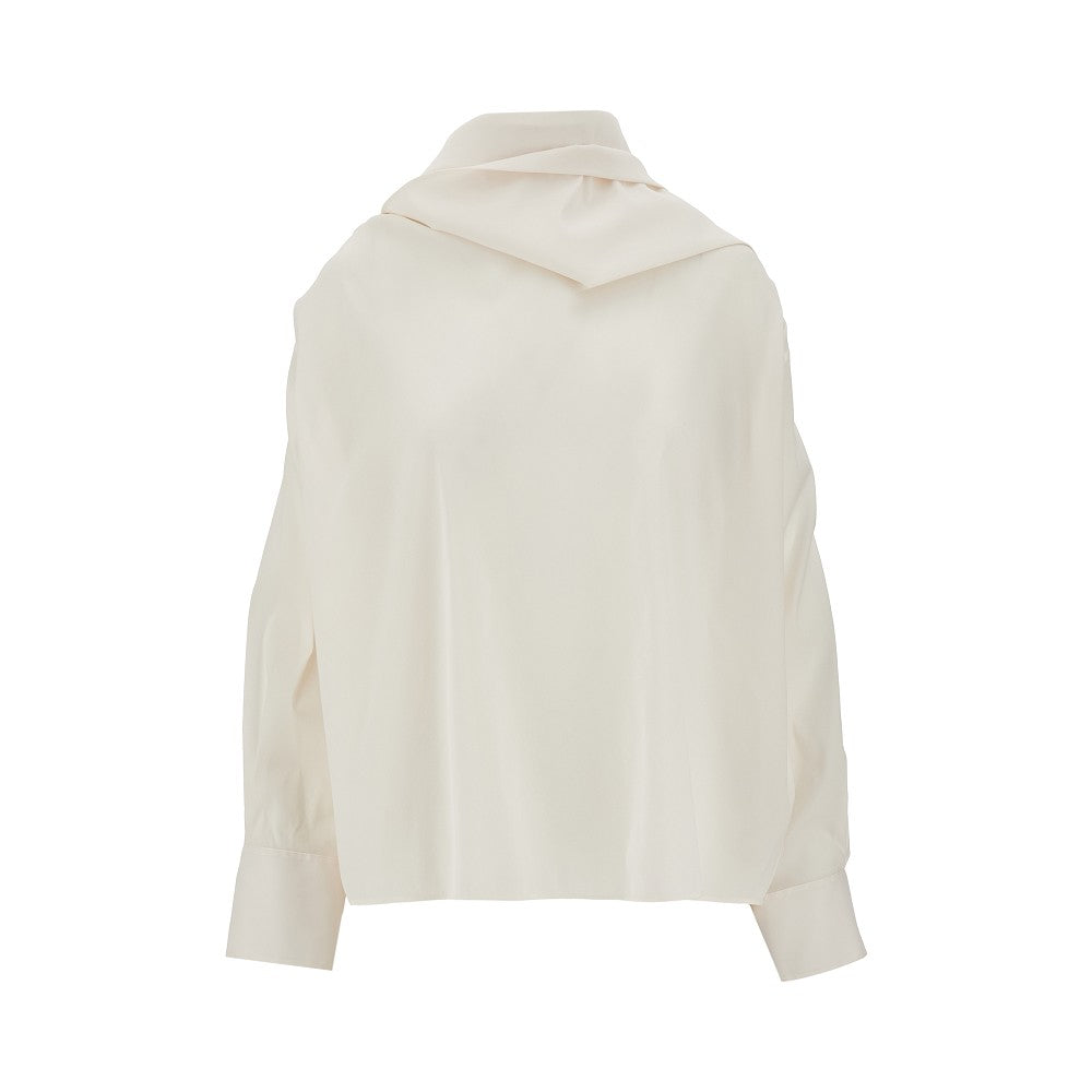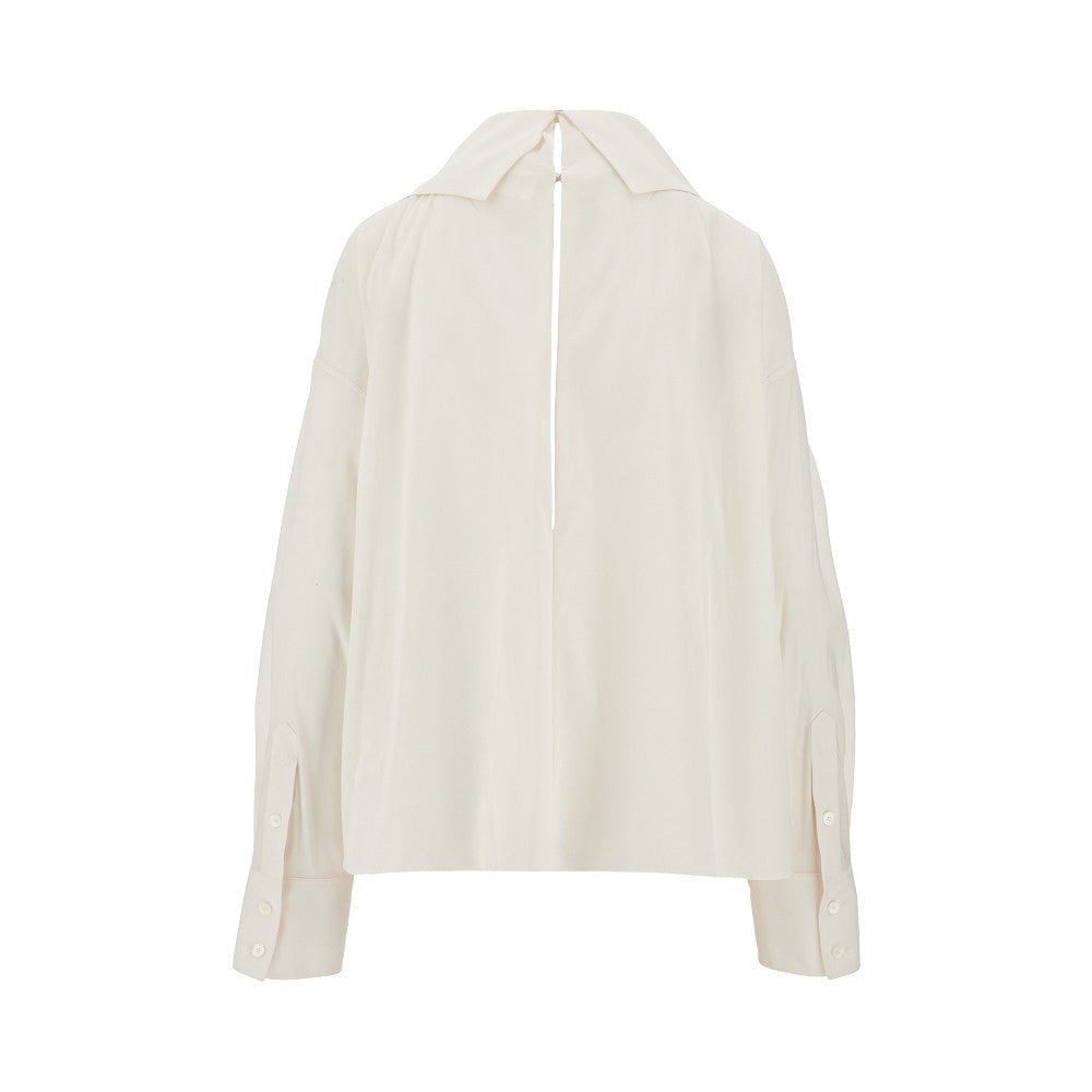 Blouse made from stretch silk-blend toile, featuring integrated scarf to wrap around the neck. Two-button cuffs. Buttons closure on the back of neck. Oversized silhouette.