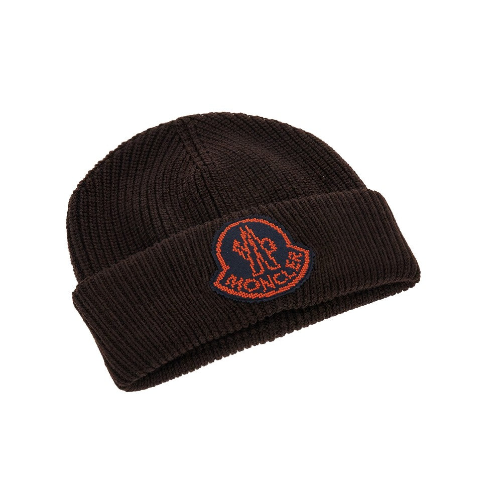 Beanie hat made from responsibly sourced virgin wool yarn with English rib motif, enriched with felt patch with logo embroidery on the cuff front.