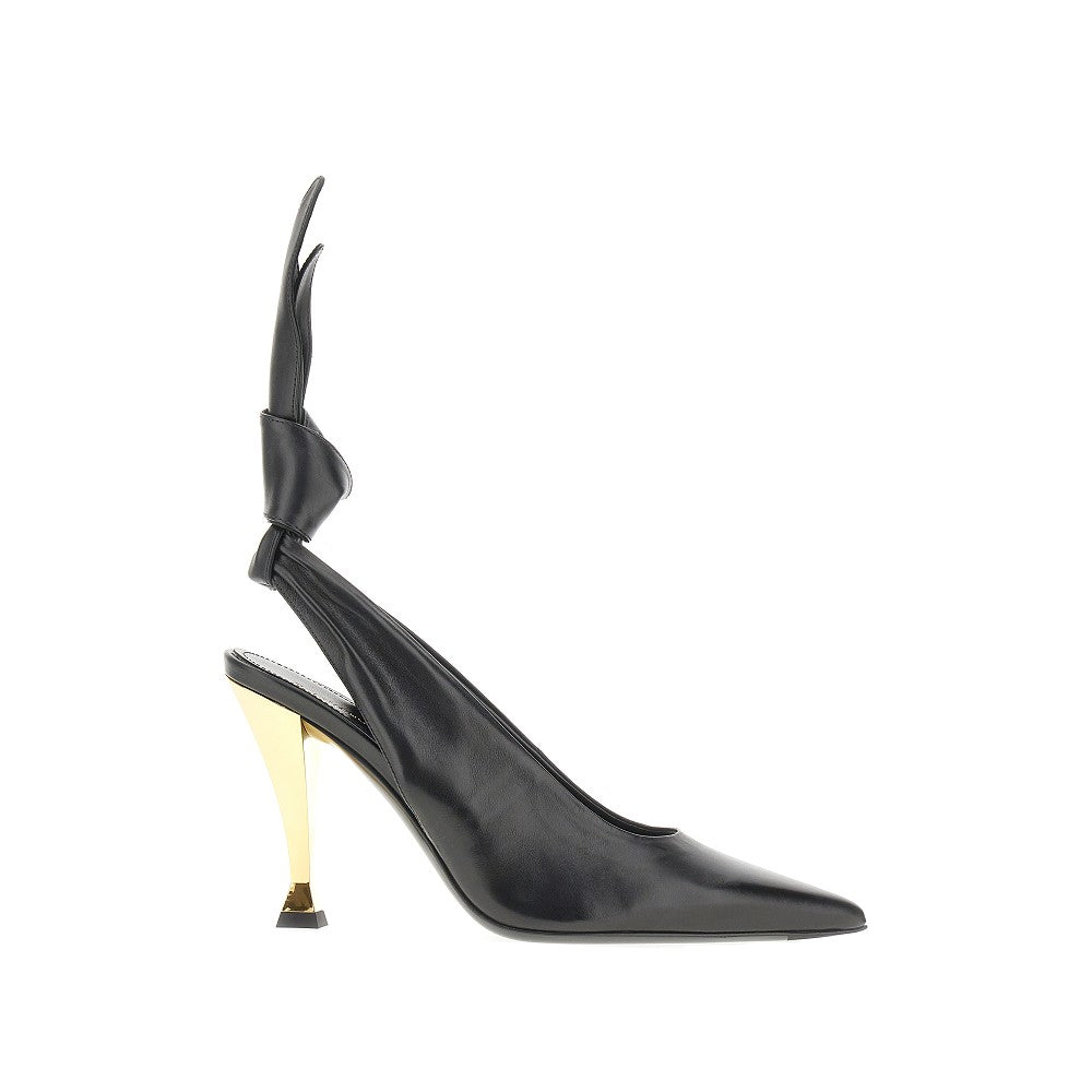 Pointed-toe slingback pumps made from nappa leather, featuring decorative bow on the rear strap. Gold-finished metal hourglass heel. Leather lining and insole. Leather sole with rubber tip inlay.