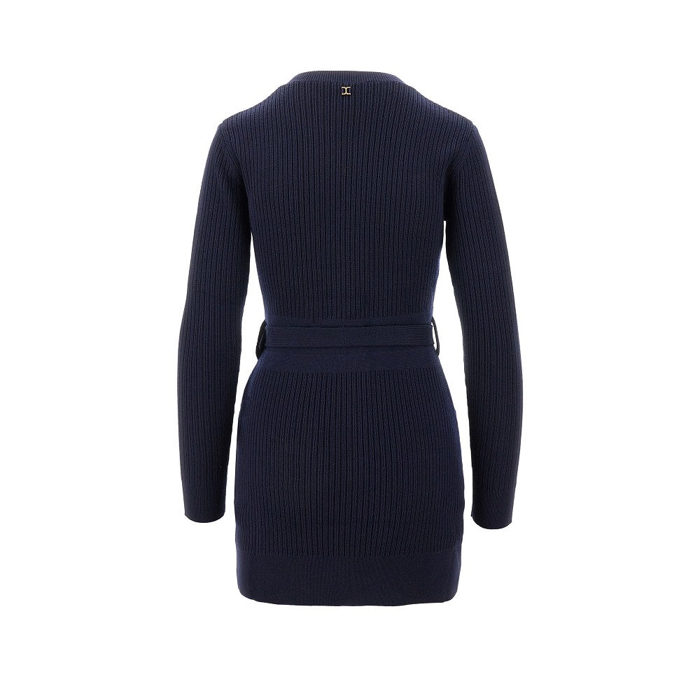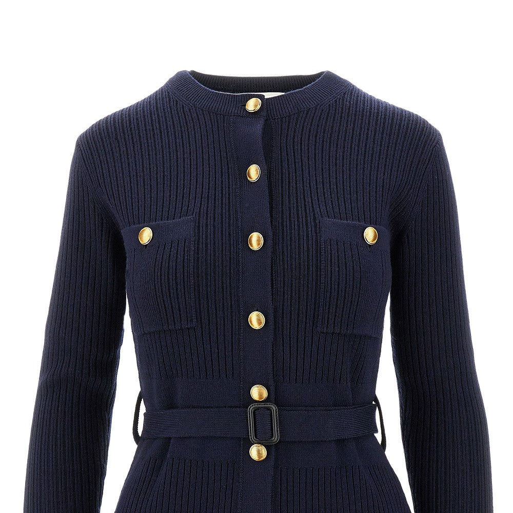 Crewneck cardigan/mini dress made from wool and viscose blend ribbed knit, featuring front closure with gold-finished metal buttons. Four patch pockets with button on front. Knitted belt with leather-covered buckle. Fitted silhouette.