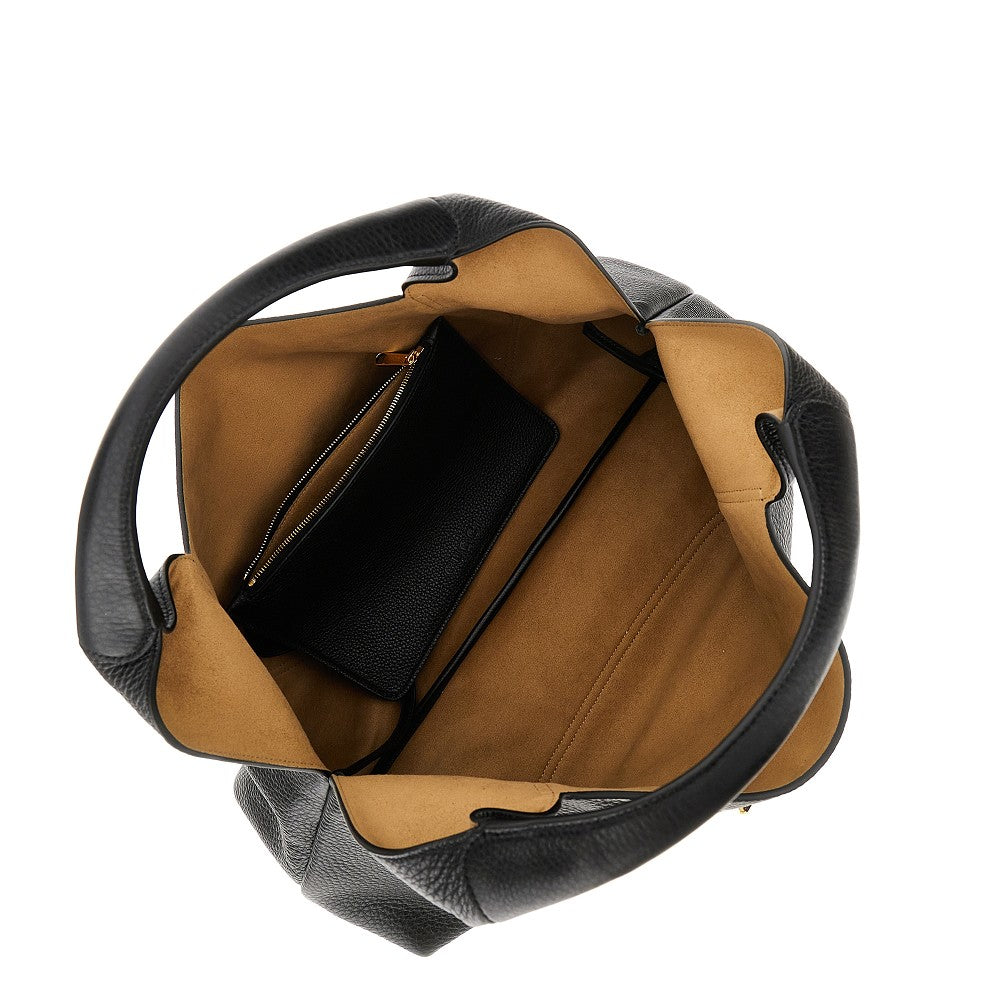 Shoulder bag made from soft grained leather, featuring Horsebit magnetic closure with engraved logo. Double handle. Suedette interior, equipped with a detachable zippered pouch with debossed lettering logo at front. Gold-finished metalware.