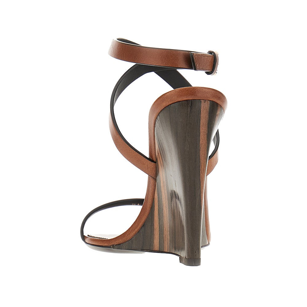 Salomè sandals made from soft leather, featuring wood wedge. Adjustable ankle strap with gold-finished metal buckle and crossed on front. Almond-toe. Leather lining and insole. Leather sole.