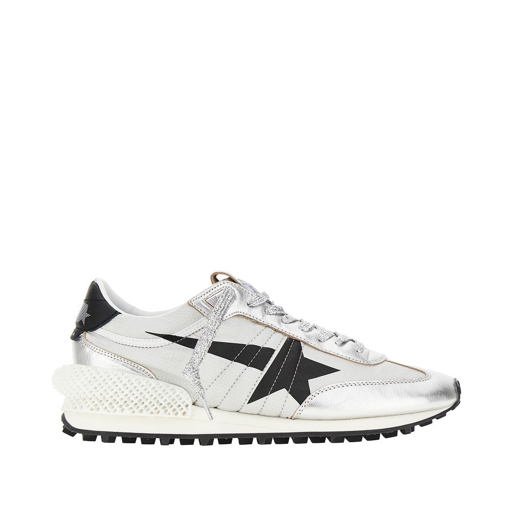 Sneakers made from ripstop nylon with metallized leather details and mesh tongue, enriched with star print on the side and laminated nappa leather heel tab. 3D-printed stabilizer on the back. Lurex laces closure. Fabric lining and removable insole. Rubber sole.