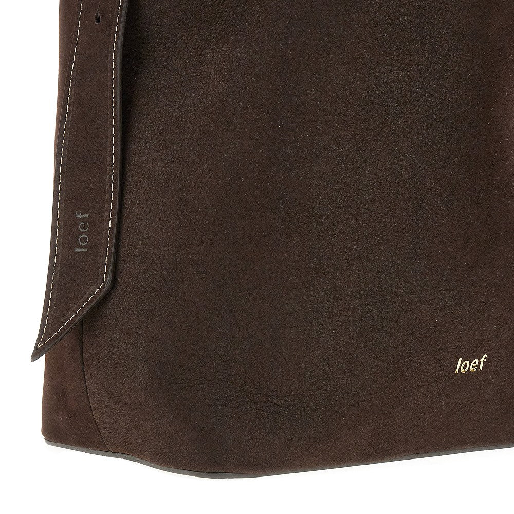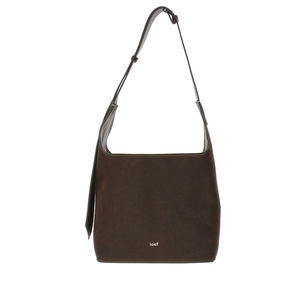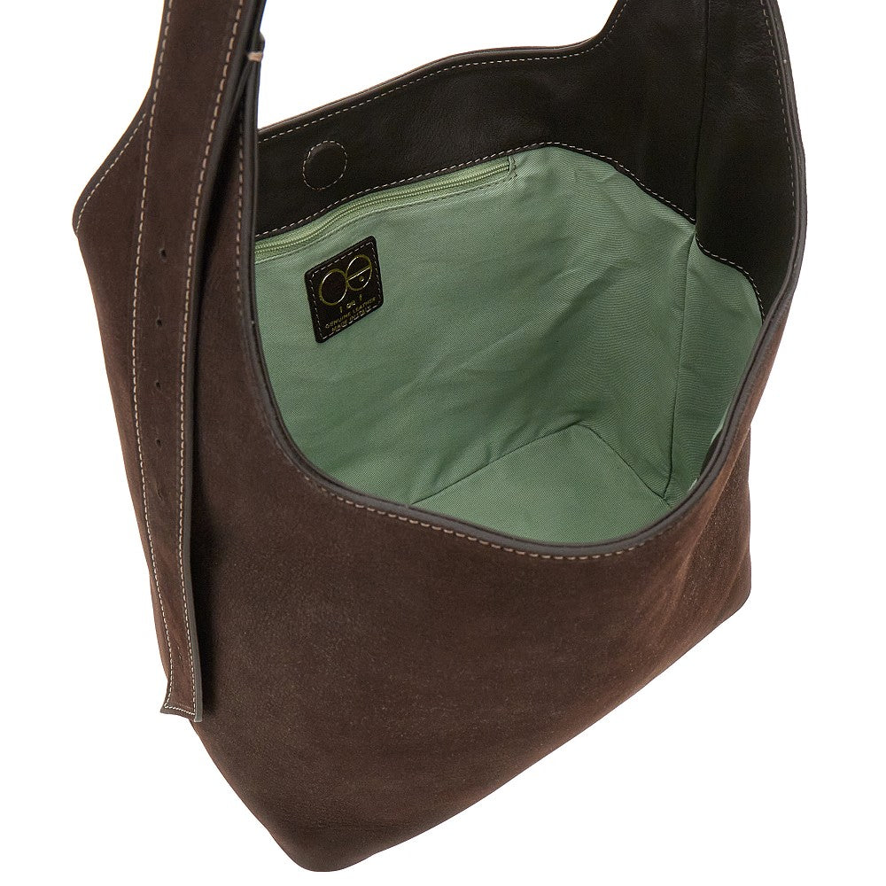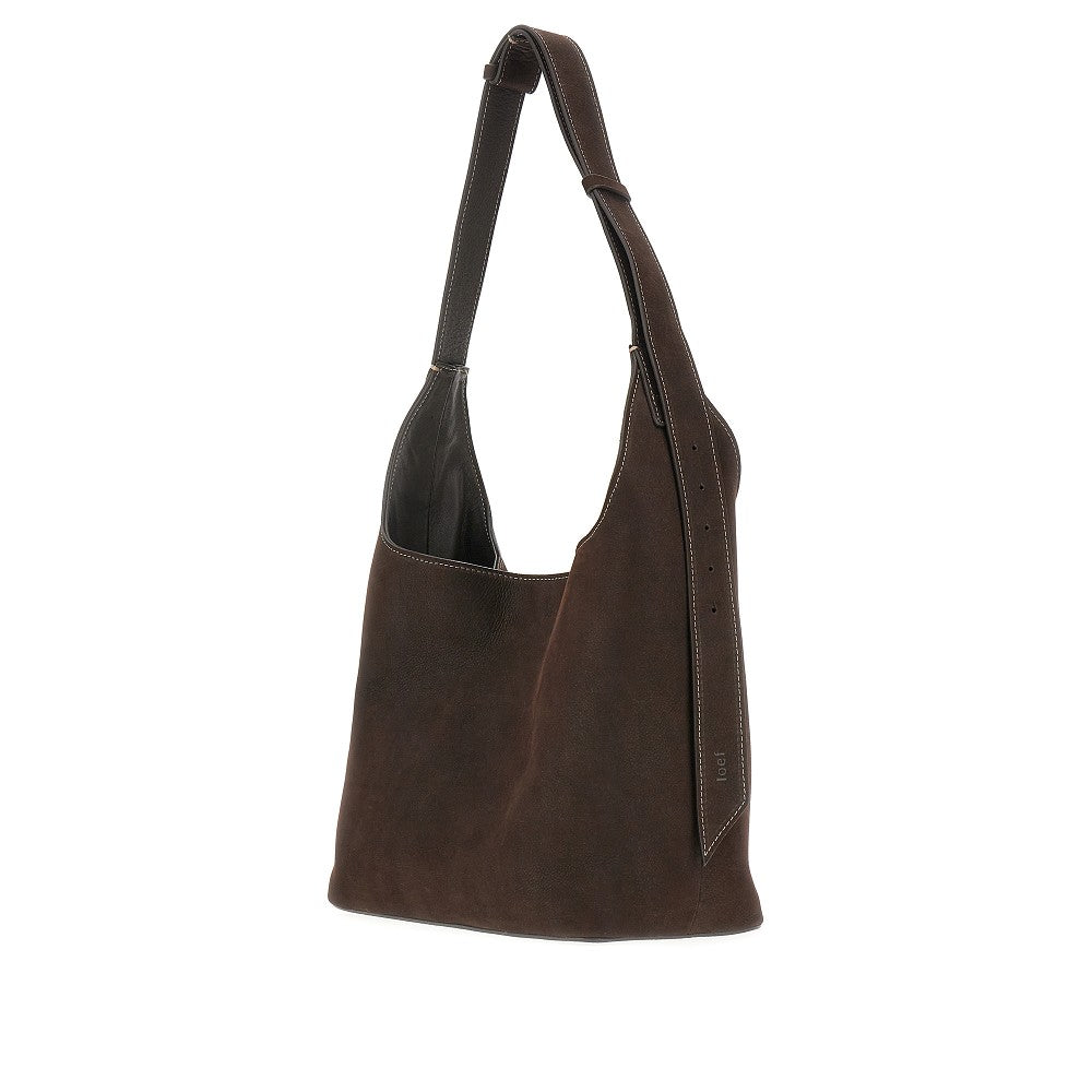 Bag made from natural grain soft nubuck leather, featuring adjustable shoulder strap to carry on the shoulder or crossbody. Gold-tone logo print on front. Magnetic closure. Twill-lined interior with a patch pocket and a zippered one.