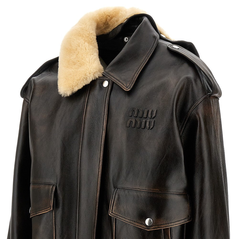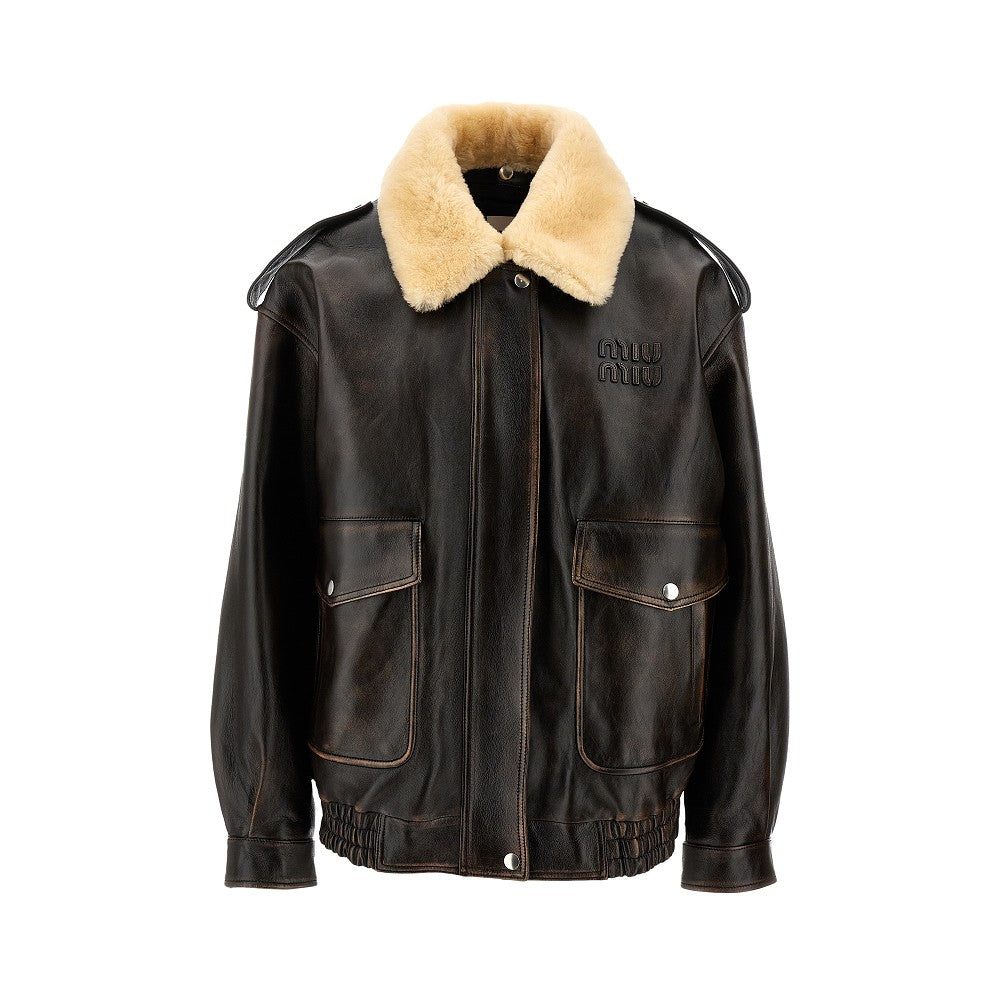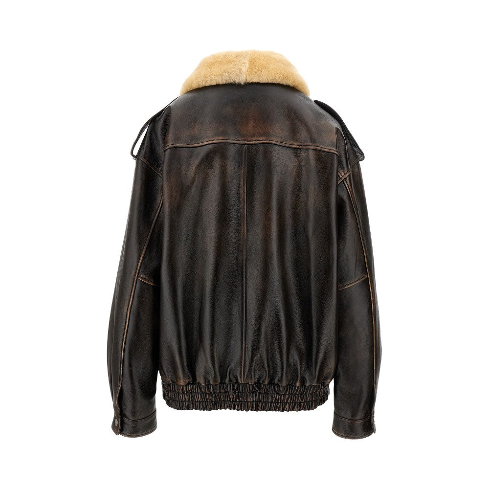 Jacket made from padded nappa leather, featuring shearling fur collar. Logo patch on the chest. Zip closure and flap with press-studs. Shoulder epaulettes. Side welt pockets and patch ones with button-down flap. Cuffs with press-stud. Oversized silhouette with elasticated bottom hem.
