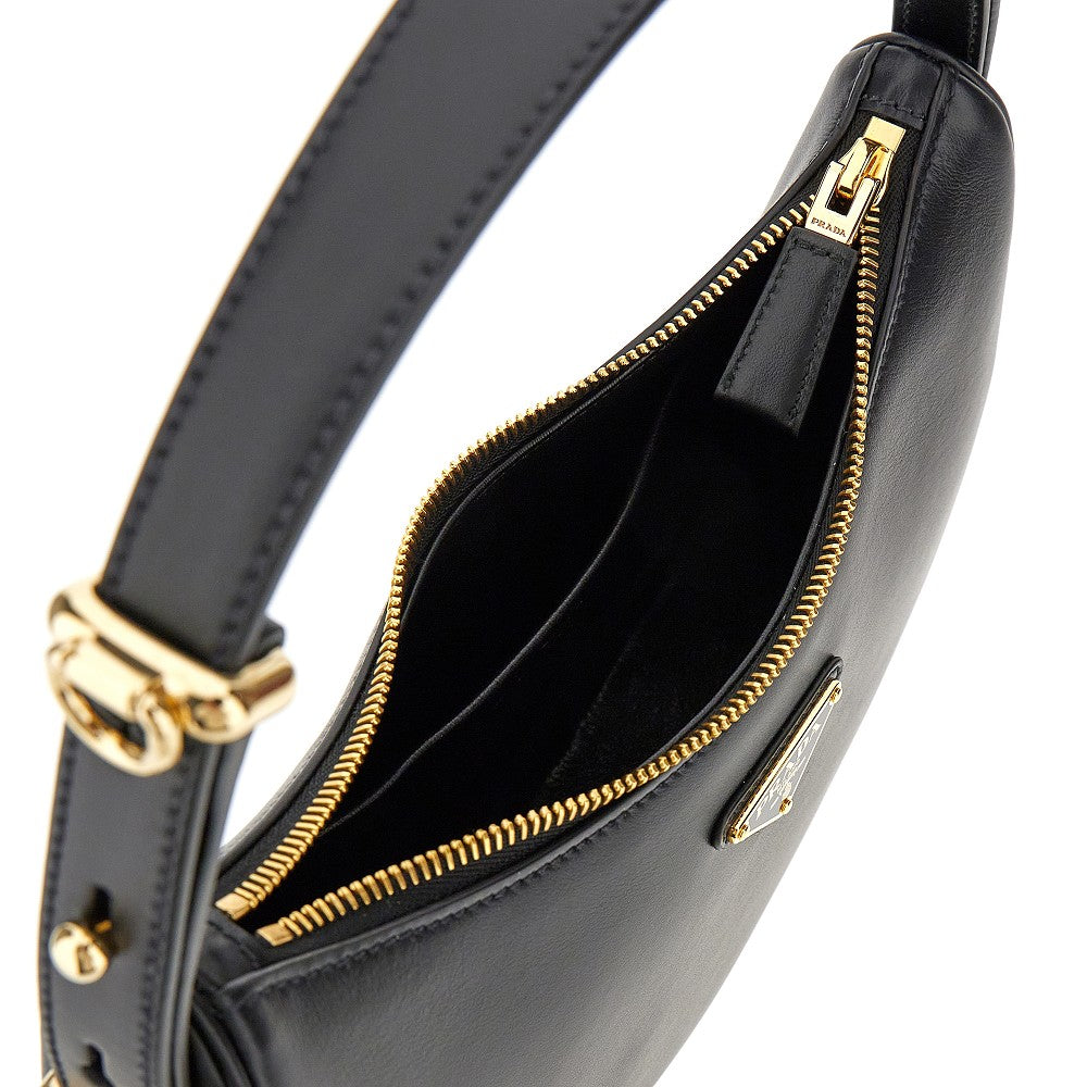 Prada Arqué bag in soft smooth leather, enriched with signature enameled metal triangle logo detail on front. Adjustable strap with extension insert, to carry on the shoulder or crossbody. Zip closure, nappa leather lining and one inner patch pocket. Gold-finished metalware.