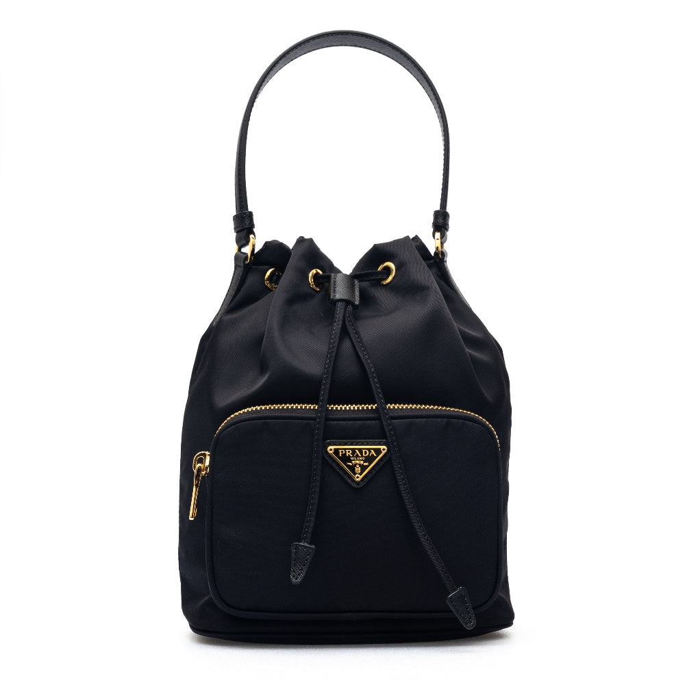 Bucket bag made from Re-Nylon regenerated nylon, enriched with enameled metal triangle logo on the front zippered pocket. Handle and adjustable and detachable shoulder strap in Saffiano leather. Drawstring closure. Branded nylon lining. Gold-finished metalware.