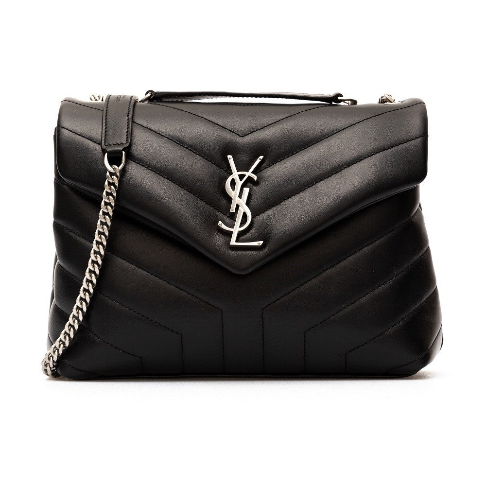 Small Loulou bag in Y-quilted leather, featuring sliding chain double handle with leather inserts convertible into a shoulder strap. Flap with magnetic button and metal YSL monogram. Fabric-lined interior with a patch pocket and a zippered middle one. Antique silver-finished metalware.
