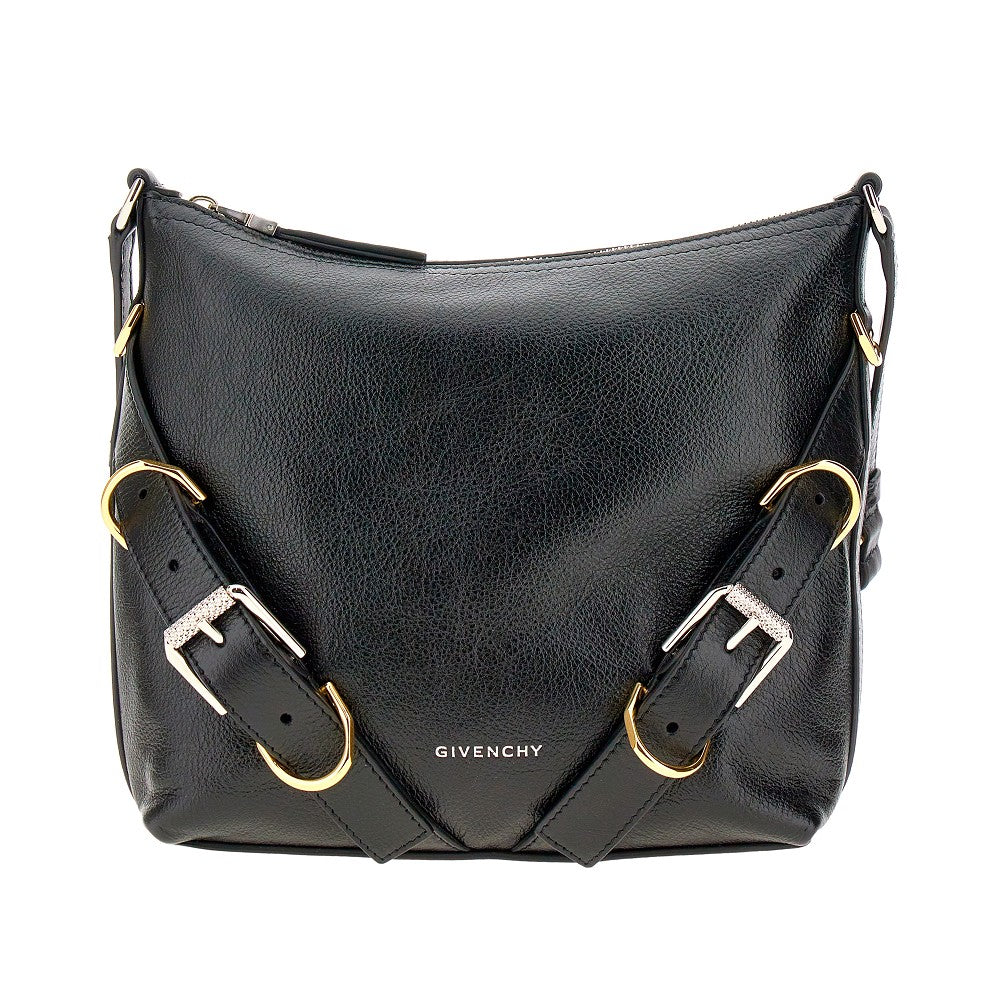 Bag made from soft grained leather, embellished with front decorative straps with buckles and rings in silver and gold finished metal. Shoulder strap with double adjustment. Zip closure. Canvas lining and one inner patch pocket.