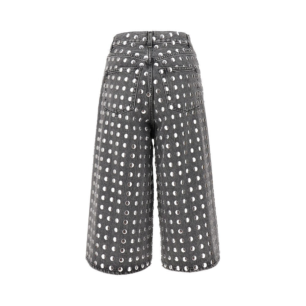 Five-pocket bermuda shorts made from cotton denim, enriched with all-over silver-finished metal rounded studs. High-rise silhouette with wide leg. Belt loops, zip fly and button closure.