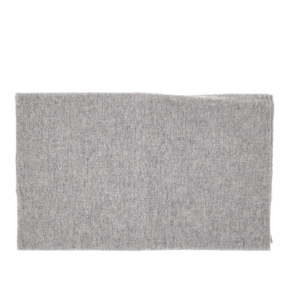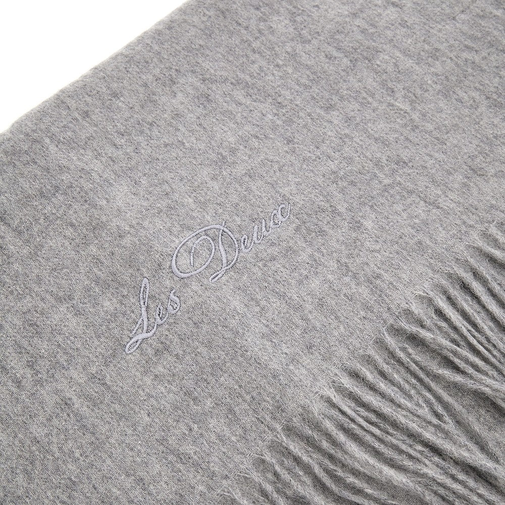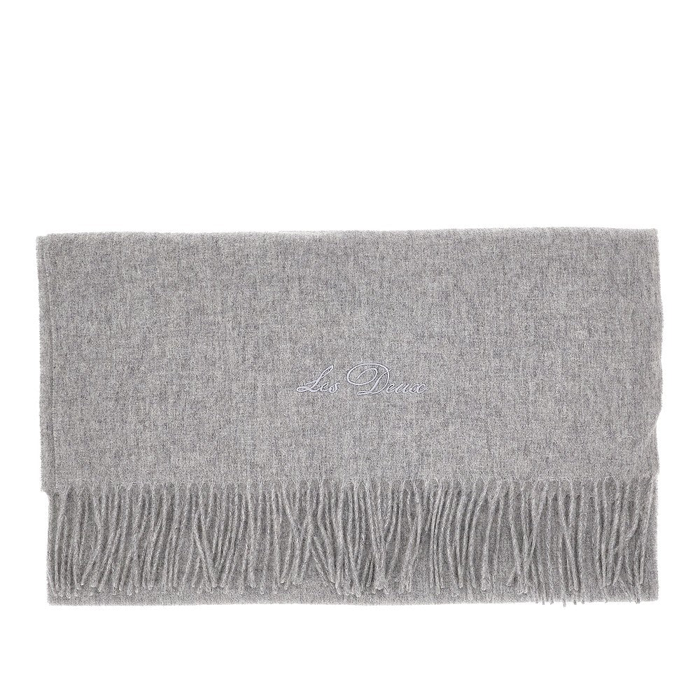 Scarf made from pure wool soft fabric, enriched with tone-on-tone signature embroidery. Fringed ends.