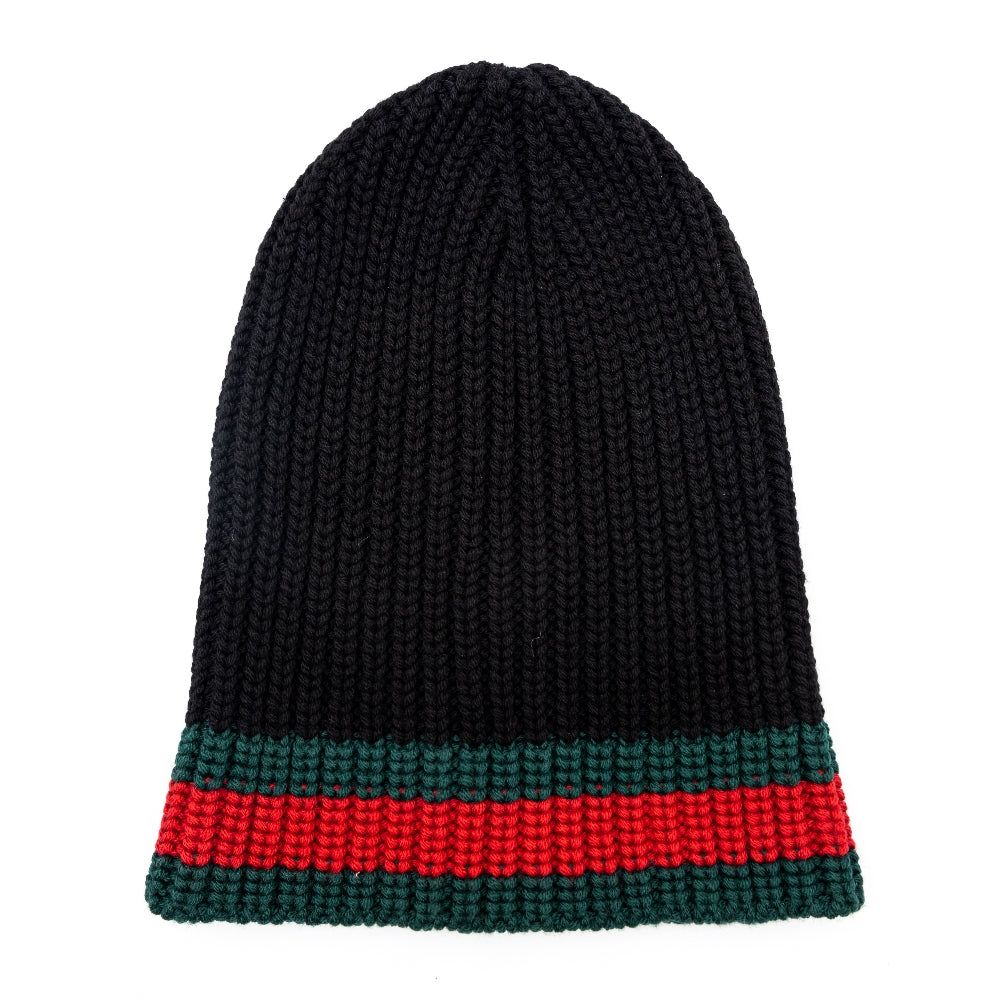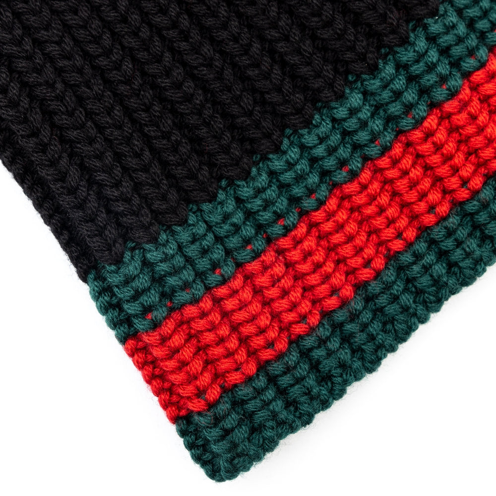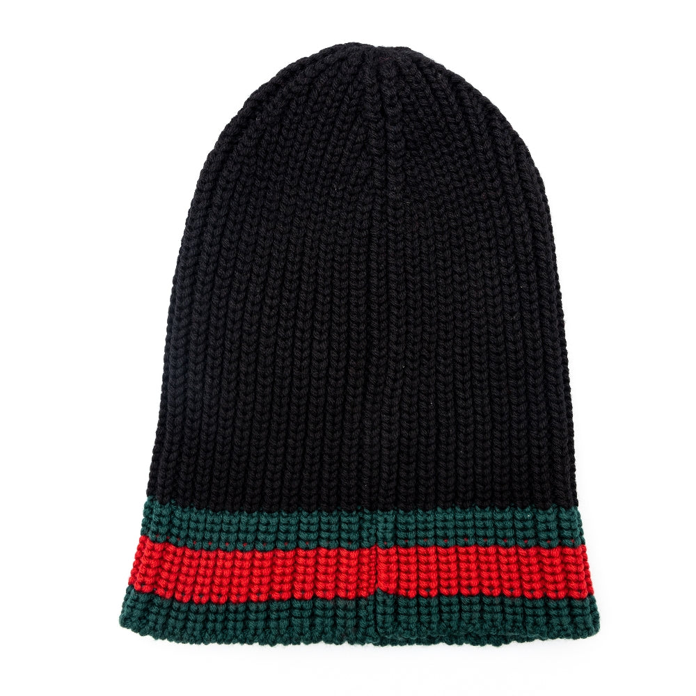 Beanie hat made from pure wool yarn, enriched with jacquard Web striped motif on the edge.