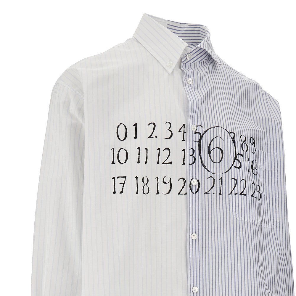 Shirt made from cotton poplin with striped motif, featuring asymmetrical design. Numerical signature print on front and patch pocket on the chest. Button-down collar, front closure with mother-of-pearl buttons and blunted cuffs with buttons. Rear white stitch line. Relaxed fit.