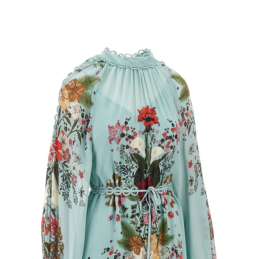 Long dress made from viscose georgette with floral pattern, enriched with rounded decorative details. Mock turtleneck with buttons closure on the back, bishop sleeves with beads-embroidered button at wrist, self-tie strap at waist and bottom flounce. Equipped with viscose slip dress.