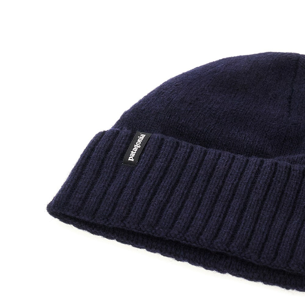 Beanie hat made from warm recycled wool blend yarn, featuring ribbed cuffs with fabric logo label on the side.