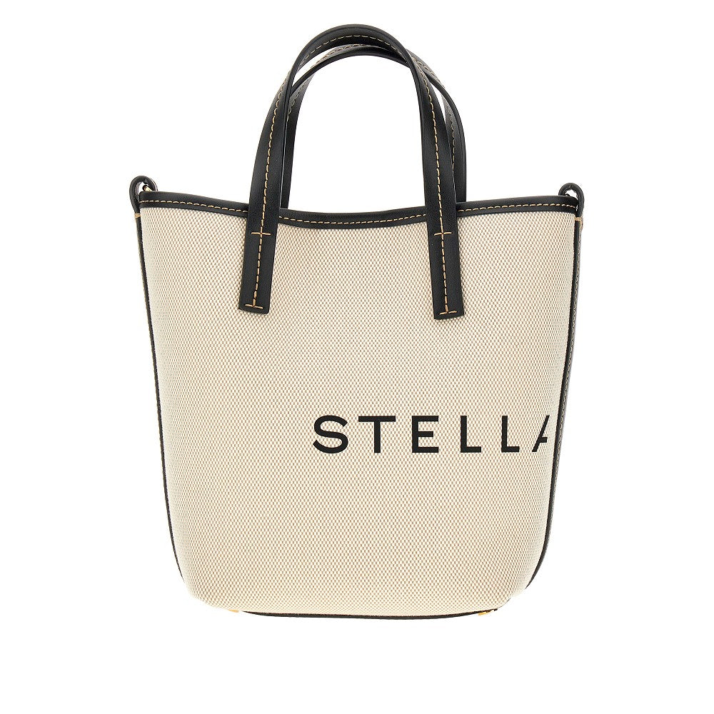 Bucket bag made from cotton-blend canvas with vegan leather details with contrasting stitchings, enriched with contrasting lettering logo print. Equipped with detachable and adjustable shoulder strap. Magnetic button closure. Alter Suede lining and one inner patch pocket. Metal bottom studs.
