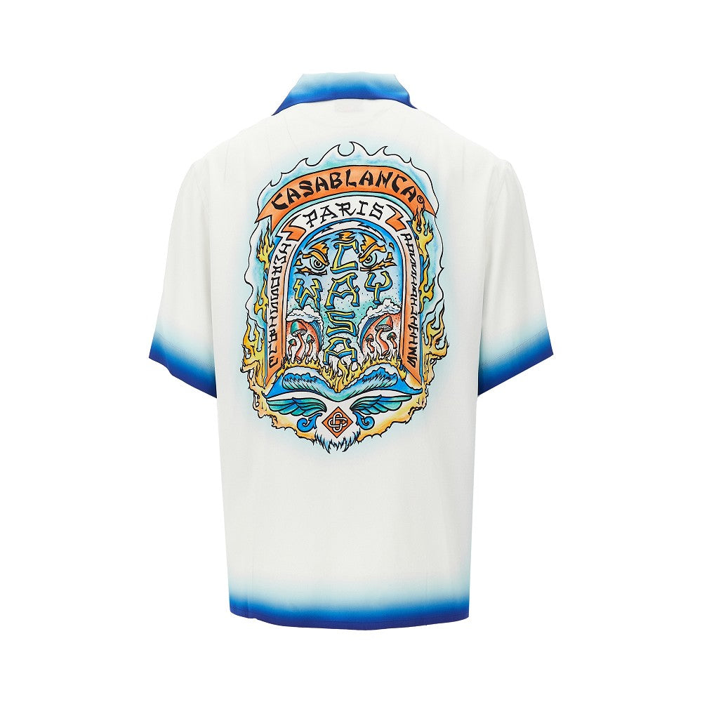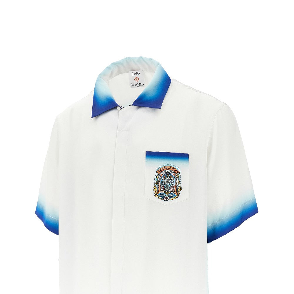 Short-sleeved shirt made from soft and lightweight pure silk satin with faded frame colouring, enriched with "Casa Way Skate" graphic motif at back and on the chest patch pocket. Concealed front buttons closure and Cuban collar. Straight and regular cut.