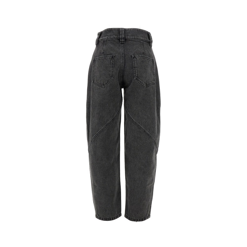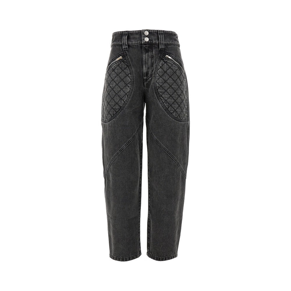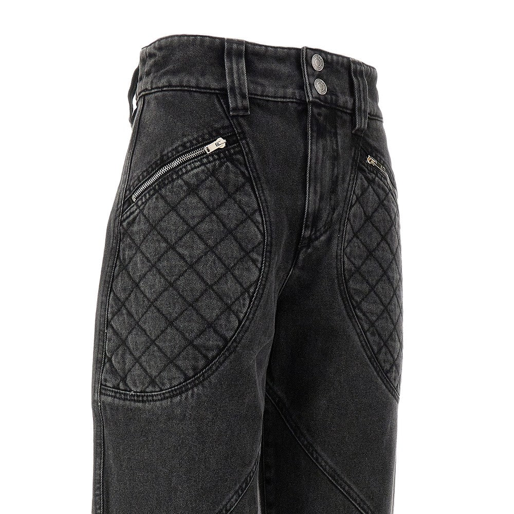 Pants made from cotton denim with bleached effect, featuring diamond-quilted details on the hips. Belt loops, zip fly and two buttons closure. Side zippered welt pockets and rear patch ones. Relaxed fit with rounded leg silhouette.