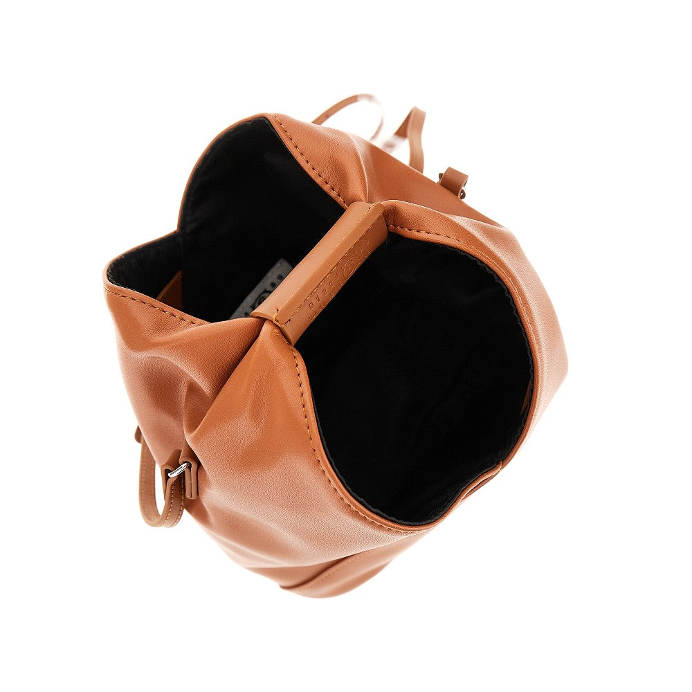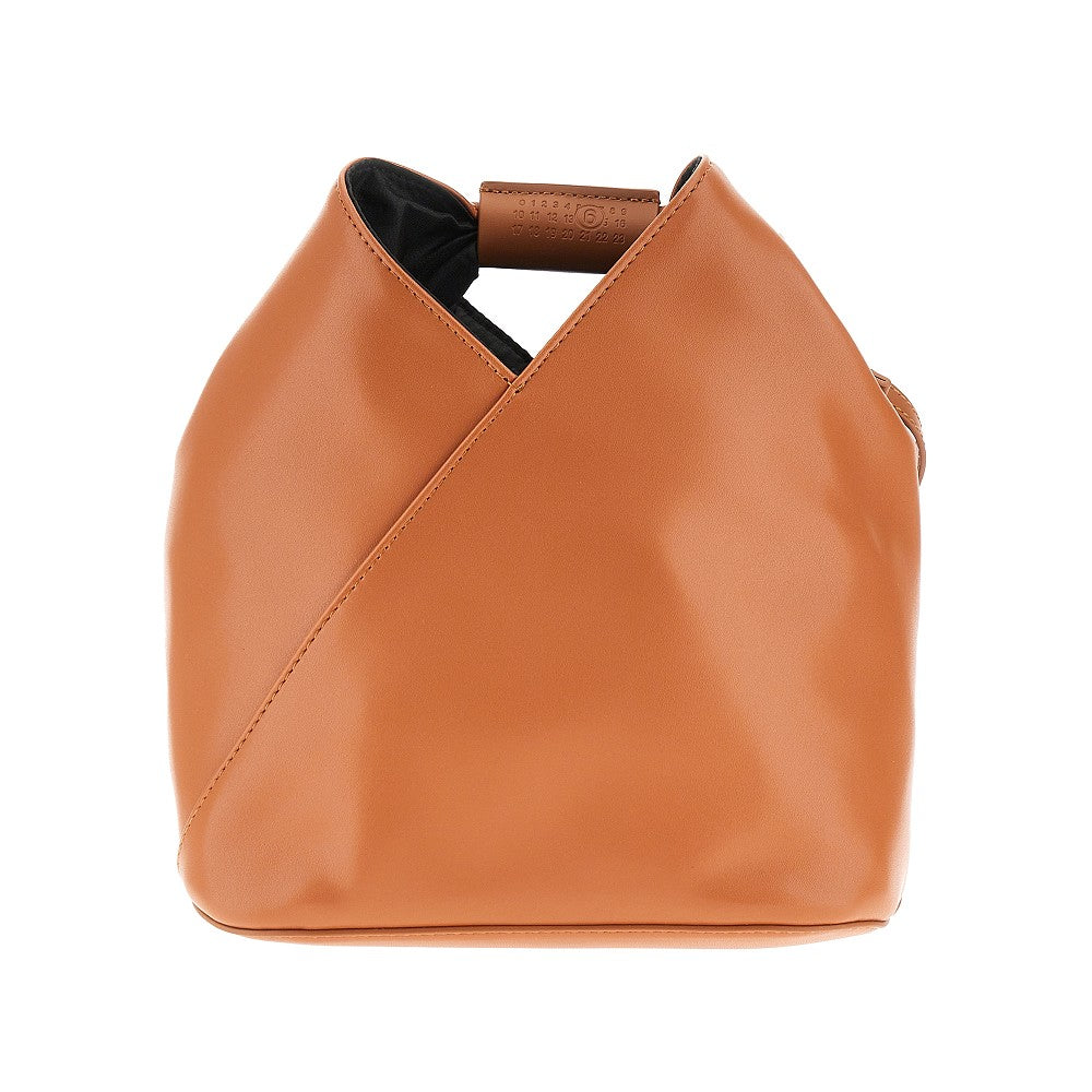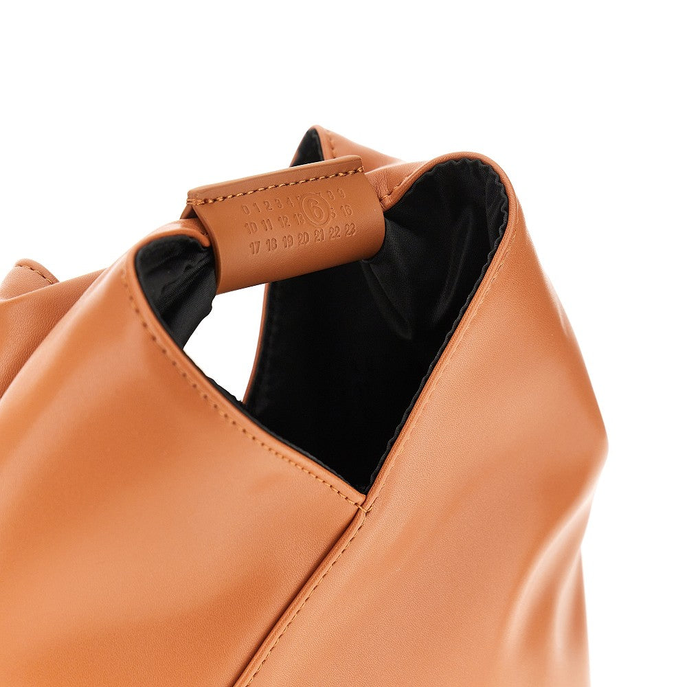 Japanese bag made from soft faux leather, featuring leather-wrapped handle with debossed numeric logo. Adjustable shoulder strap. Press-stud closure. Fabric lining. Signature white stitchline on the back.