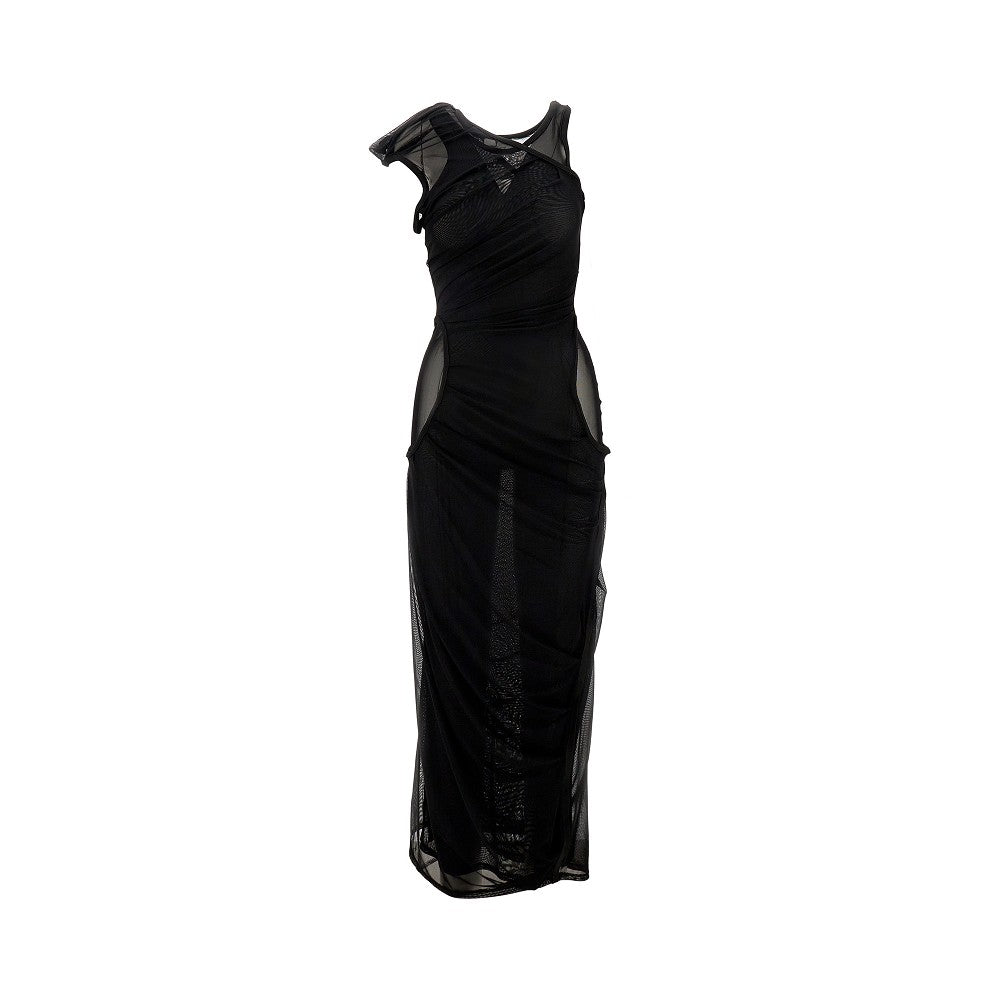 Sleeveless ankle-length dress made from two overlapping stretch mesh layers, featuring one-shoulder outer one with draped and cut-out details. Fitted silhouette.
