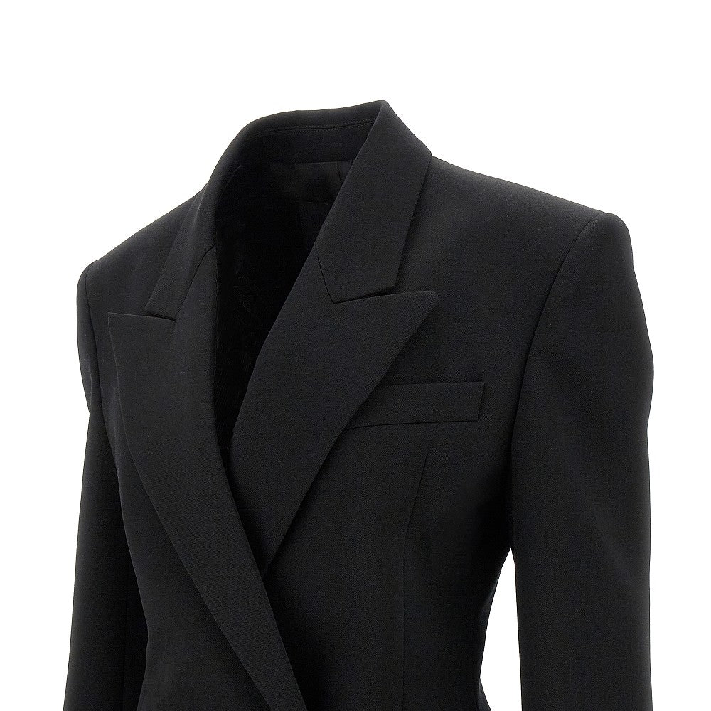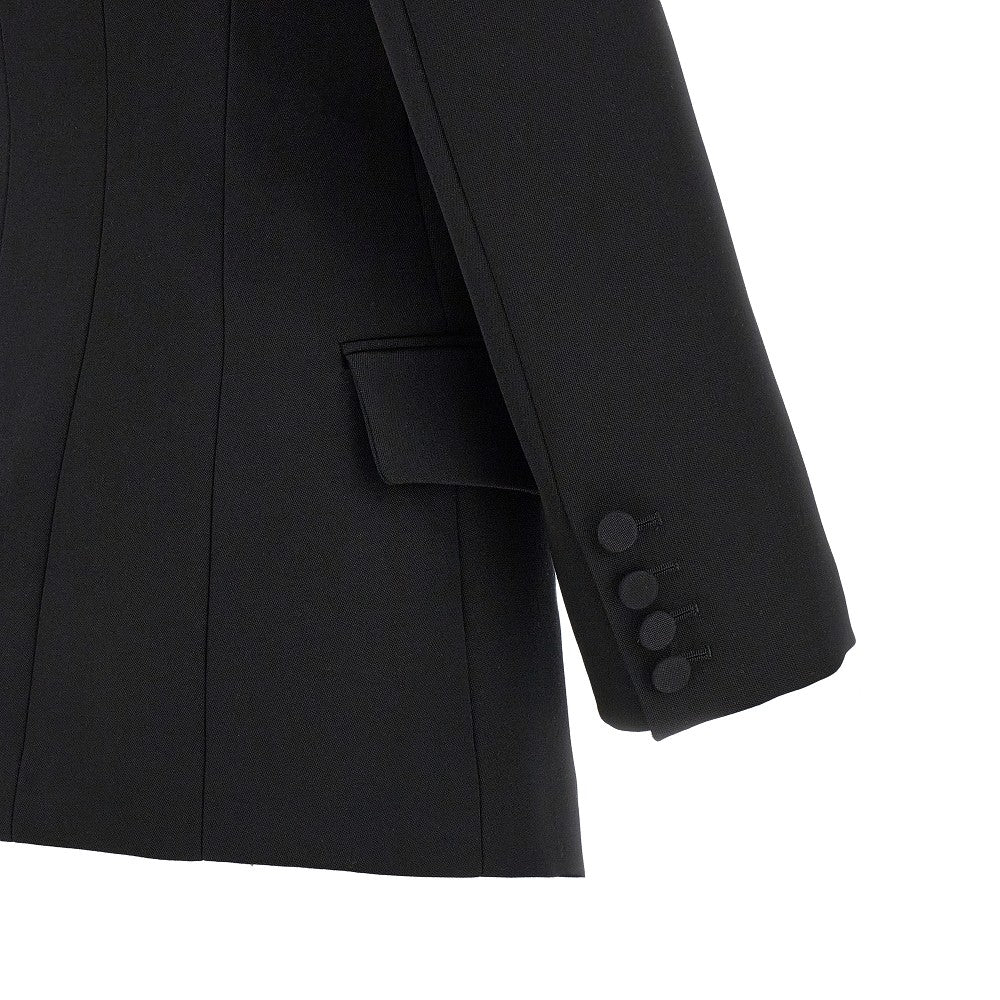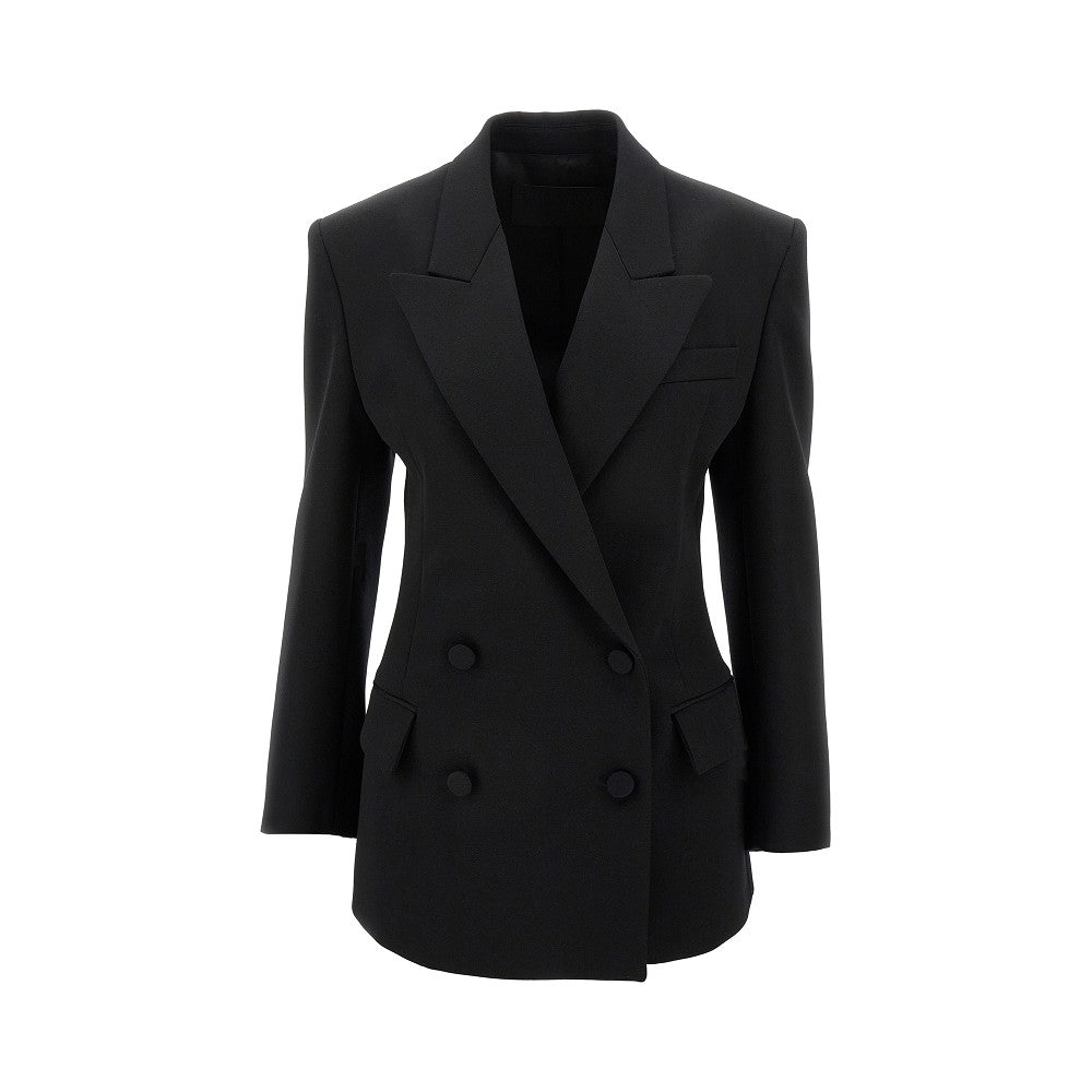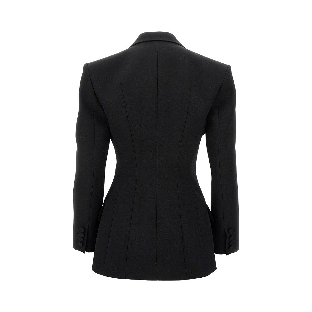 Jacket made from pure wool grisaille, featuring hourglass silhouette with cinched waist and padded wide shoulders. Double-breasted closure wirh fabric-covered buttons, peak lapel collar, side welt pockets with flap, chest pocket and buttoned cuffs. Cupro lining.