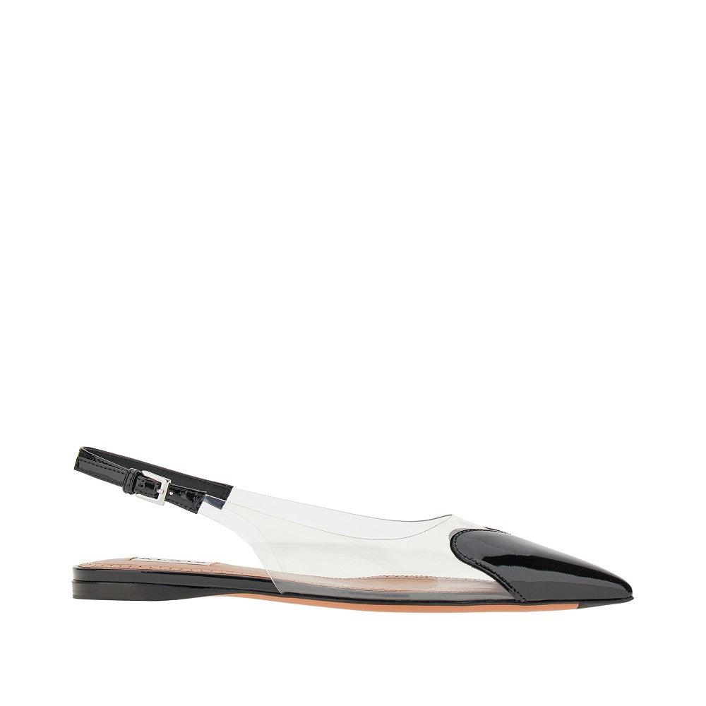 Flat slingback pumps made from trasparent PVC with patent leather heart patch on the pointed toe. Rear adjustable strap with silver-tone metal buckle, leather insole and leather sole with rubber inlays.
