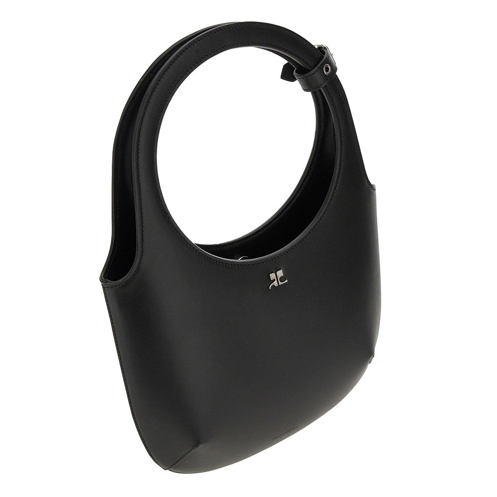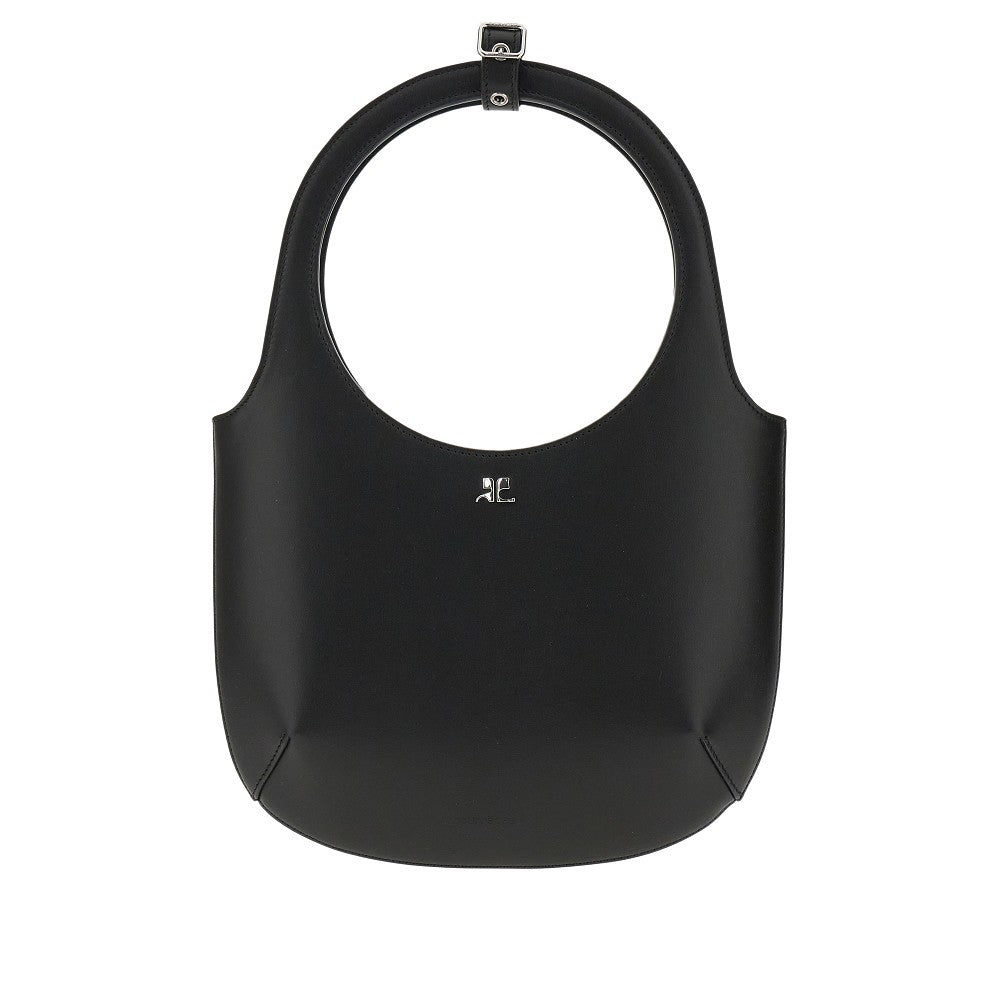 Bag made from smooth leather, featuring rounded handles with detachable buckled strap. Equipped with detachable and adjustable shoulder strap. Magnetic button closure. Suedette lining and one inner leather open flat pocket.