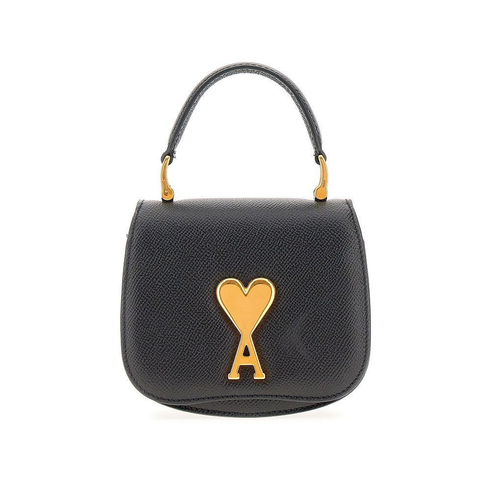 Top handle mini bag made from grained leather, featuring flap with Ami de Coeur magnetic clasp closure in gold-finished metal. Equipped with detachable and adjustable shoulder strap. Suede leather lined interior with a split compartment and a main one with a patch pocket.