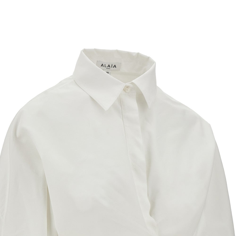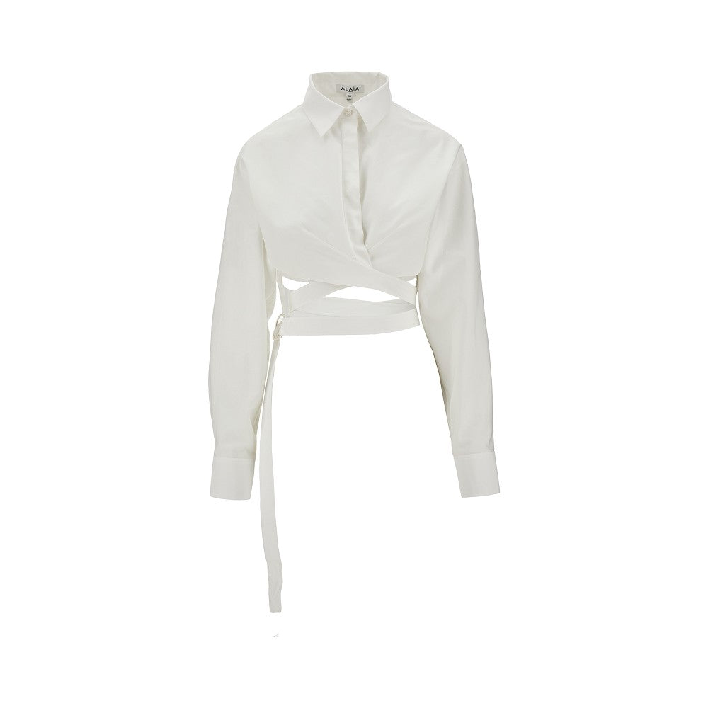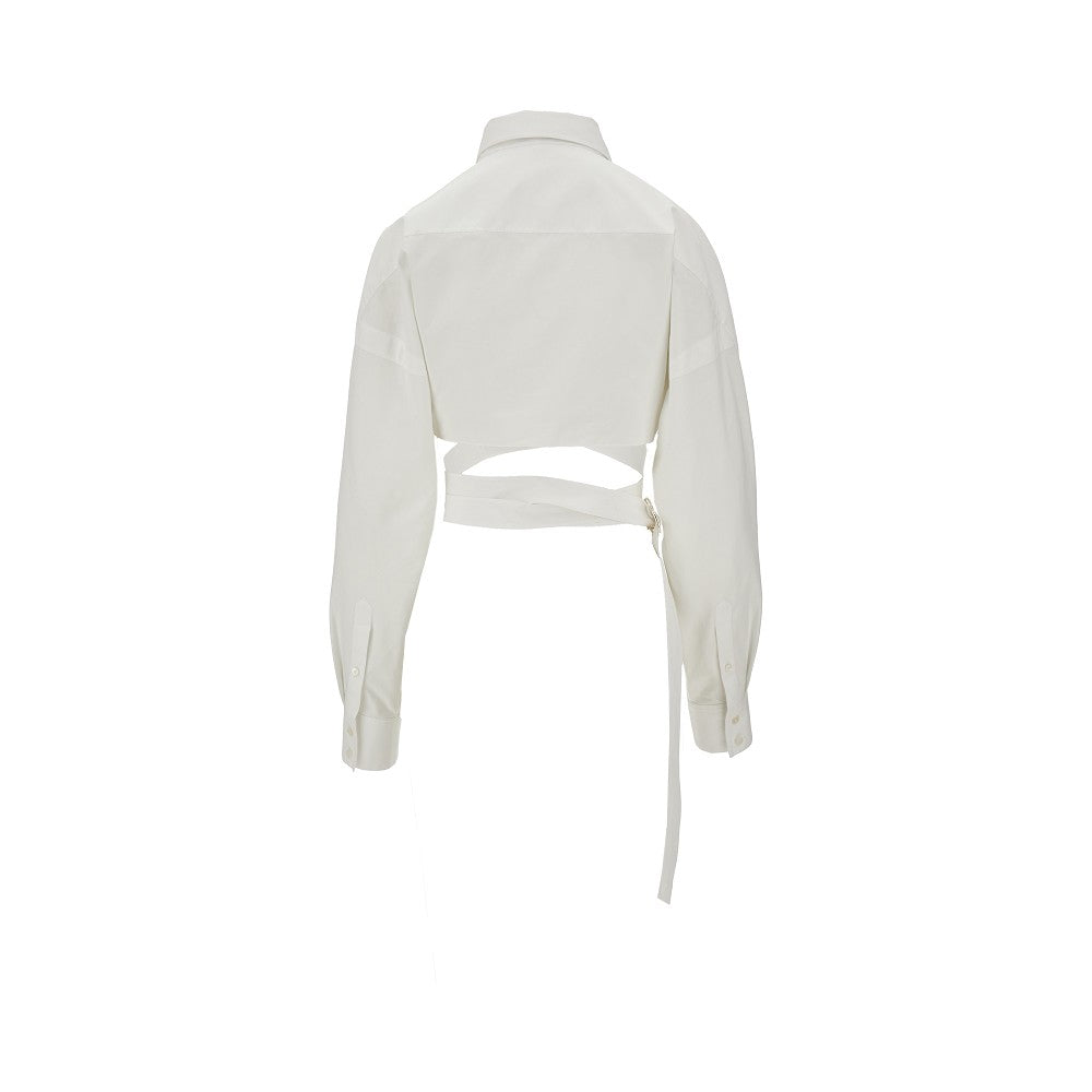 Cropped shirt made from mohair-blend light wool, featuring long straps to wrap around the waist and tie with silver-finished metal rings. Classic pointed collar, concealed closure with mother-of-pearl buttons and two-button cuffs. Kimono sleeves.